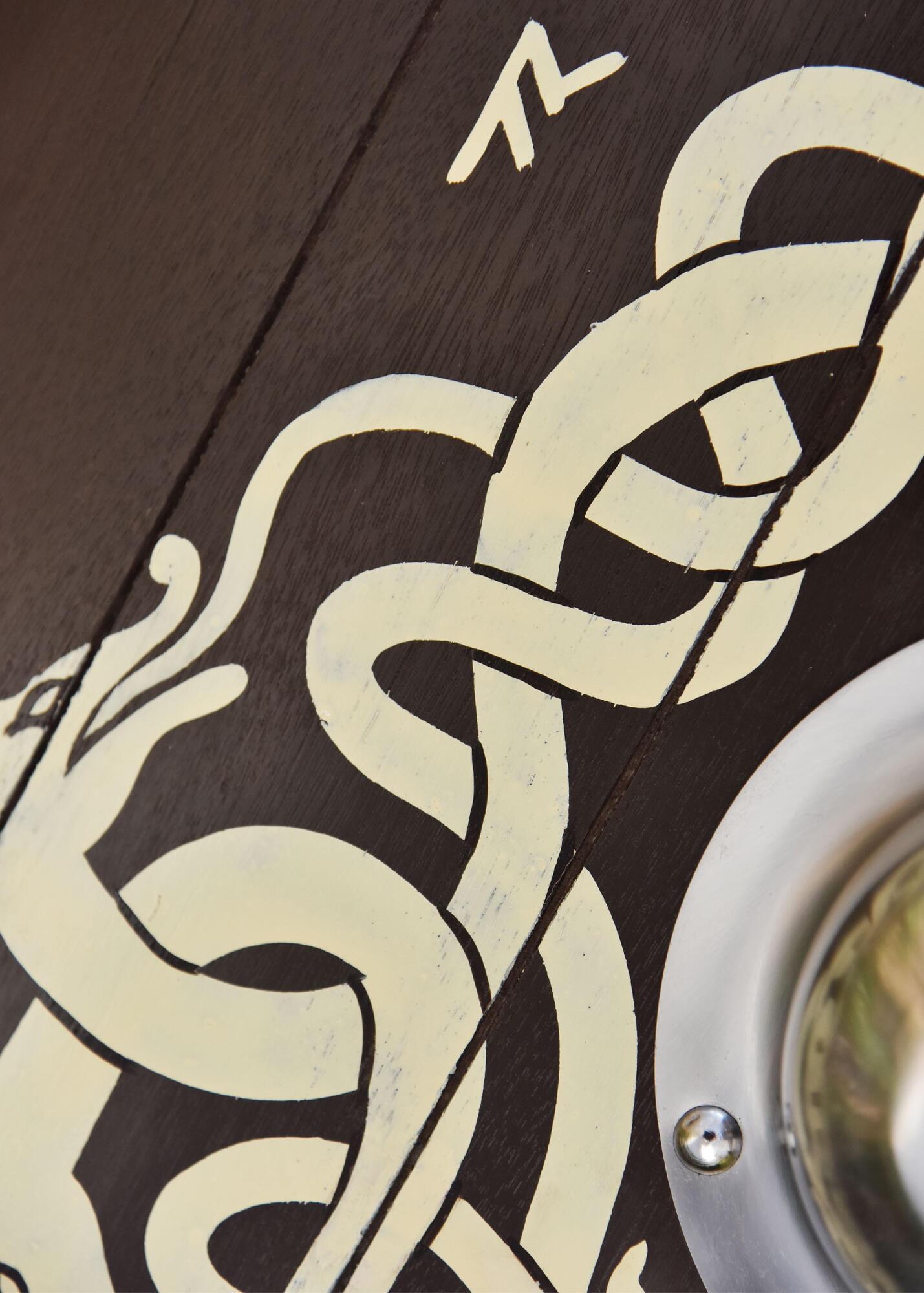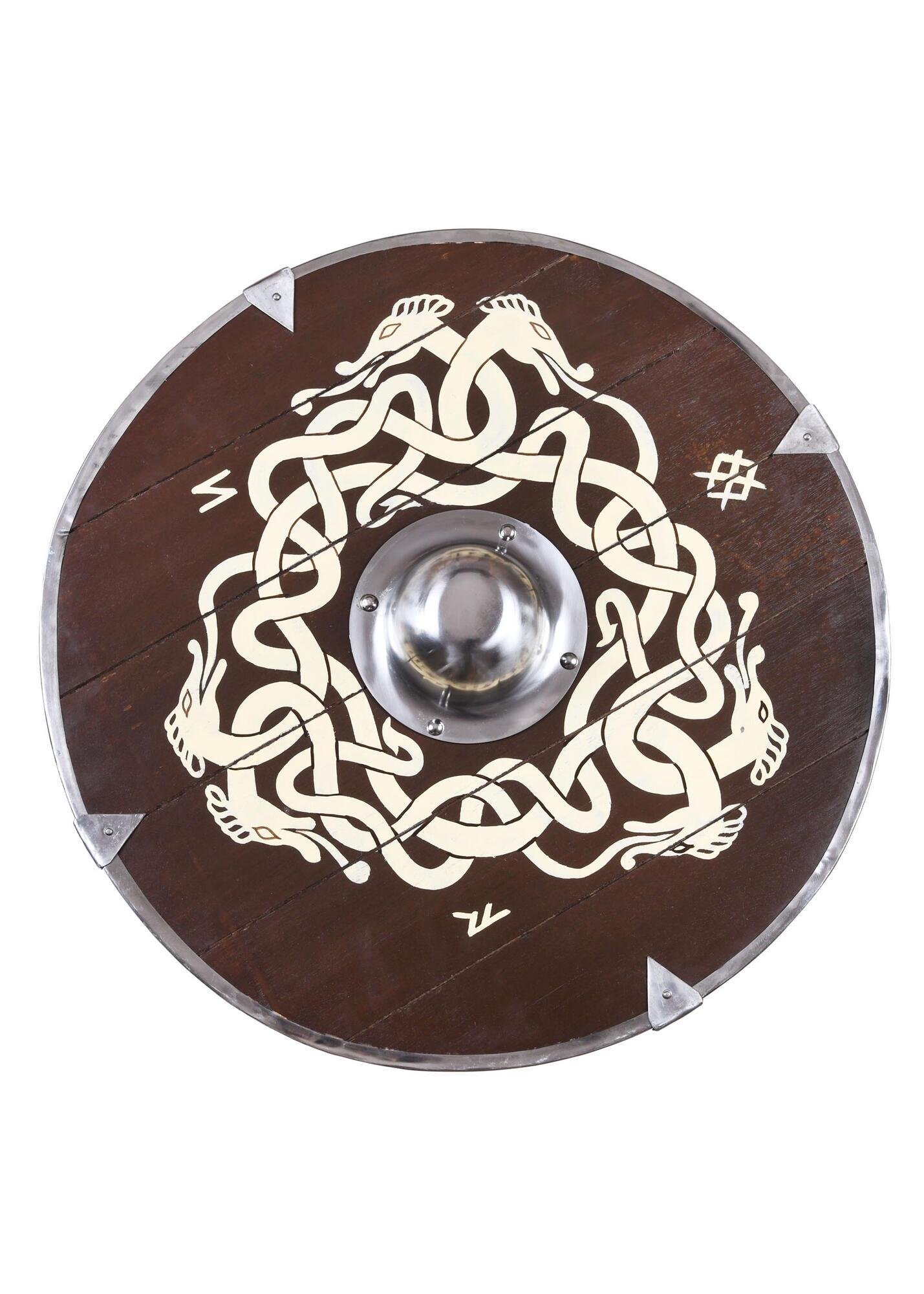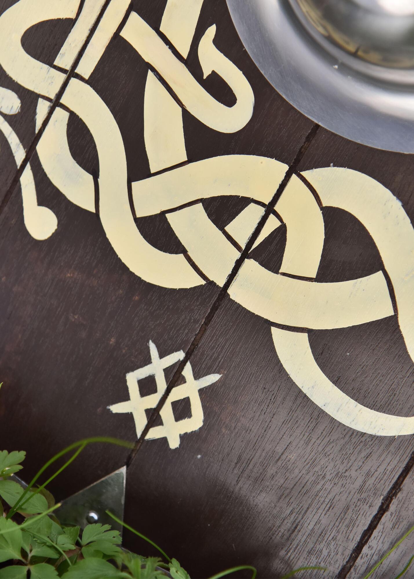 Dette dekorative rundskjold er fremstillet af ca. 13 mm kraftig krydsfiner og udsmykket med et detaljeret slangemotiv samt tre runer fra det angelsaksiske runealfabet, kendt som futhorc.