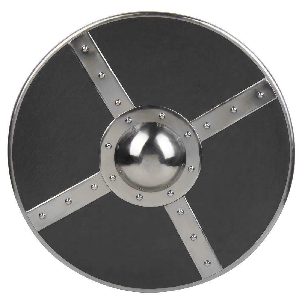 Solidt og robust træskjold i klassisk kampstil, designet til både dekoration og let rollespil. Skjoldet er rigt udsmykket og forstærket med ståldetaljer, som giver et autentisk og historisk udtryk. På bagsiden sidder to kraftige stropper, der sikrer et godt og stabilt greb, når skjoldet bæres eller udstilles.