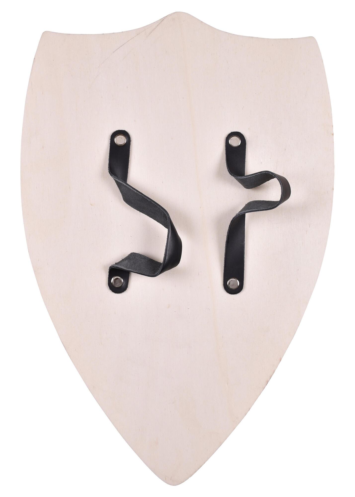 Skjoldet er fremstillet af krydsfiner og har et flot trykt motiv af Ridderen fra Löwenfels på forsiden, som giver det et autentisk middelalderligt udseende. På bagsiden er der to remme til arm og hånd, så skjoldet er nemt og sikkert at holde under leg.