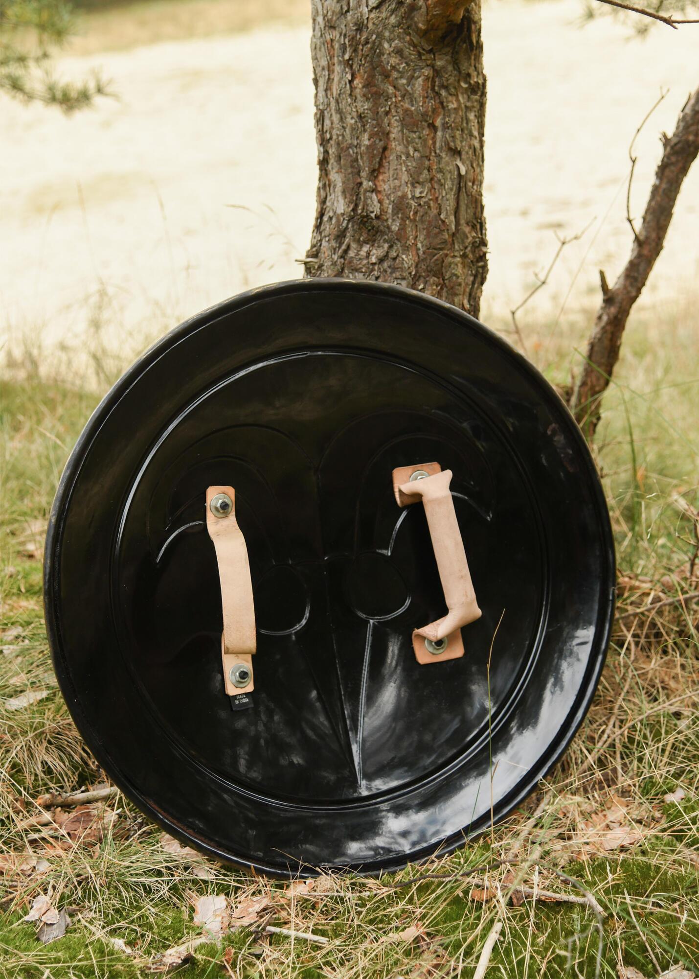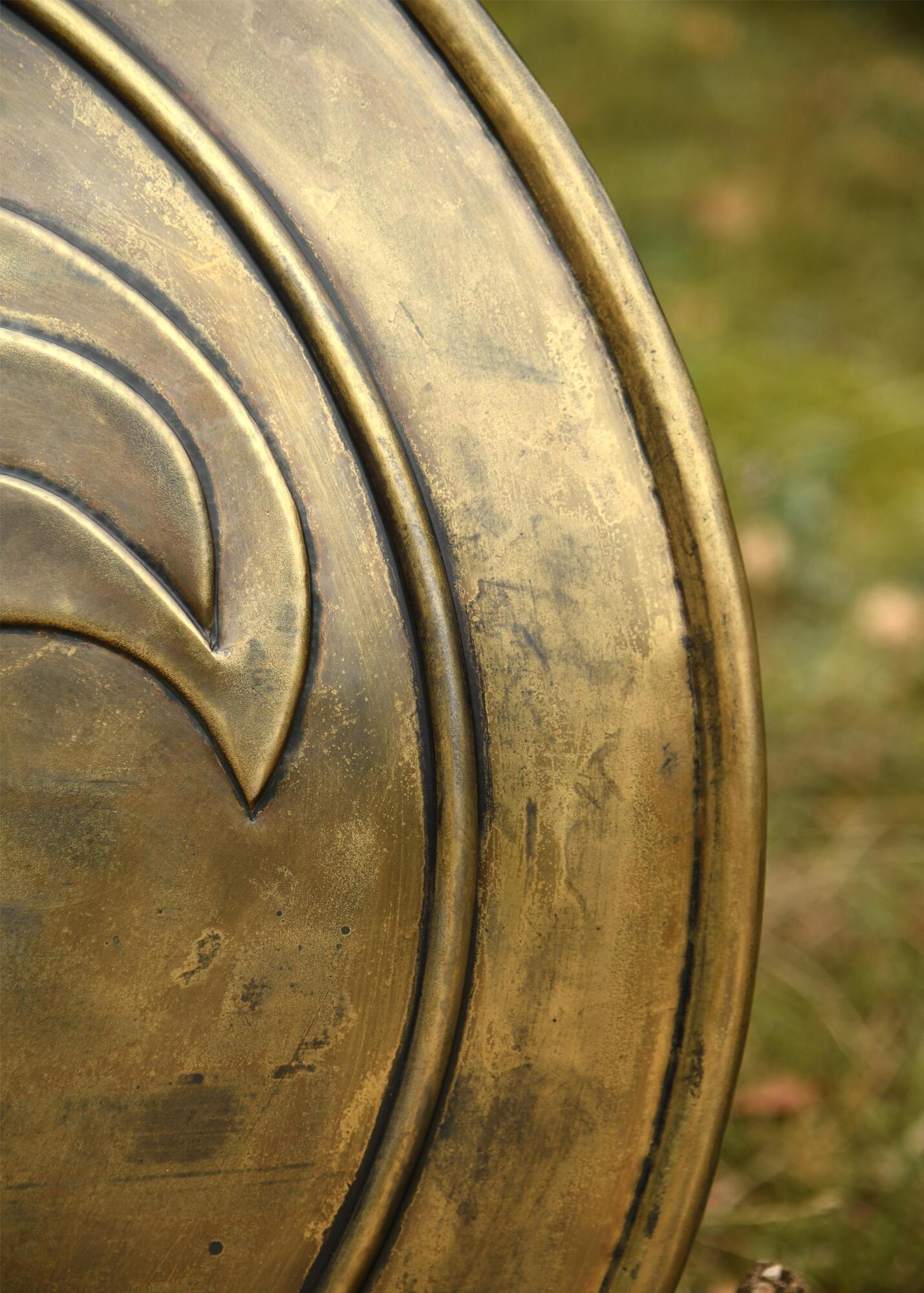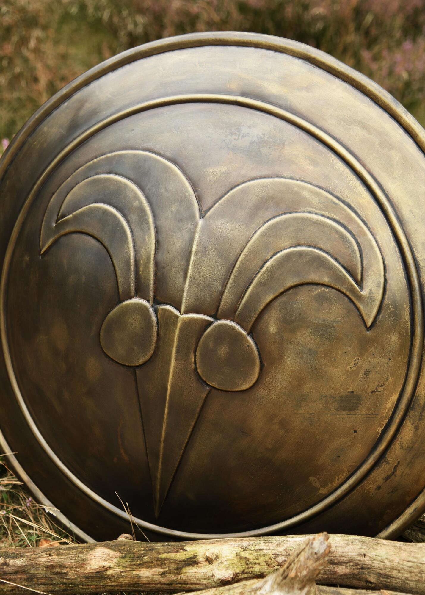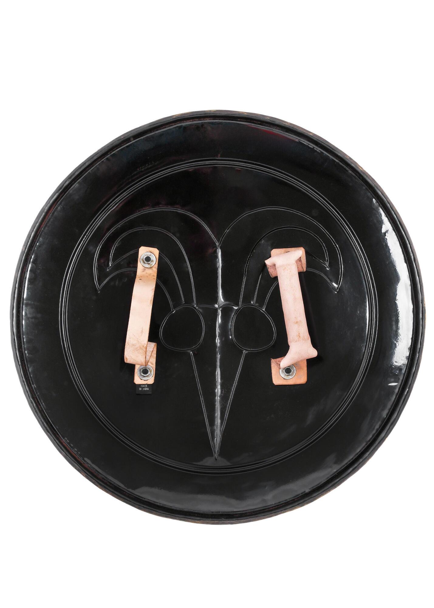 Dette dekorative skjold er fremstillet i højkulstofstål med bronzefinish og har en markant og rå fremtoning, der passer perfekt til den cimmeriske krigerstil. Bagsiden er udstyret med to solide læderremme, som gør det muligt at bære eller ophænge skjoldet.