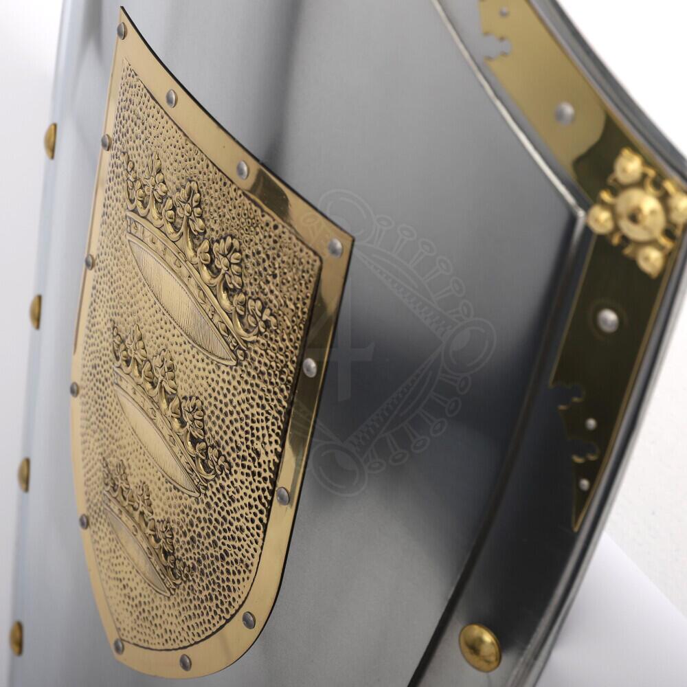 Skjoldet har den klassiske heater-form med spids bund og er fremstillet i kvalitetsmetal med en finish, der efterligner poleret rustfrit stål. Hele kanten er prydet med dekorative messingnitter, der giver et autentisk middelalderligt udtryk.