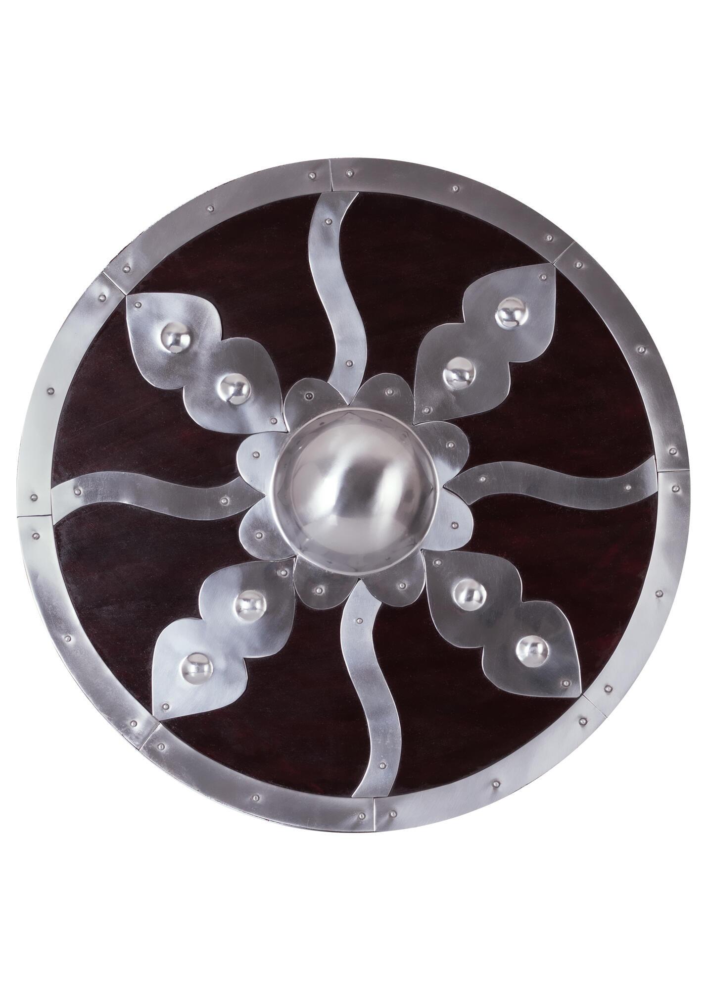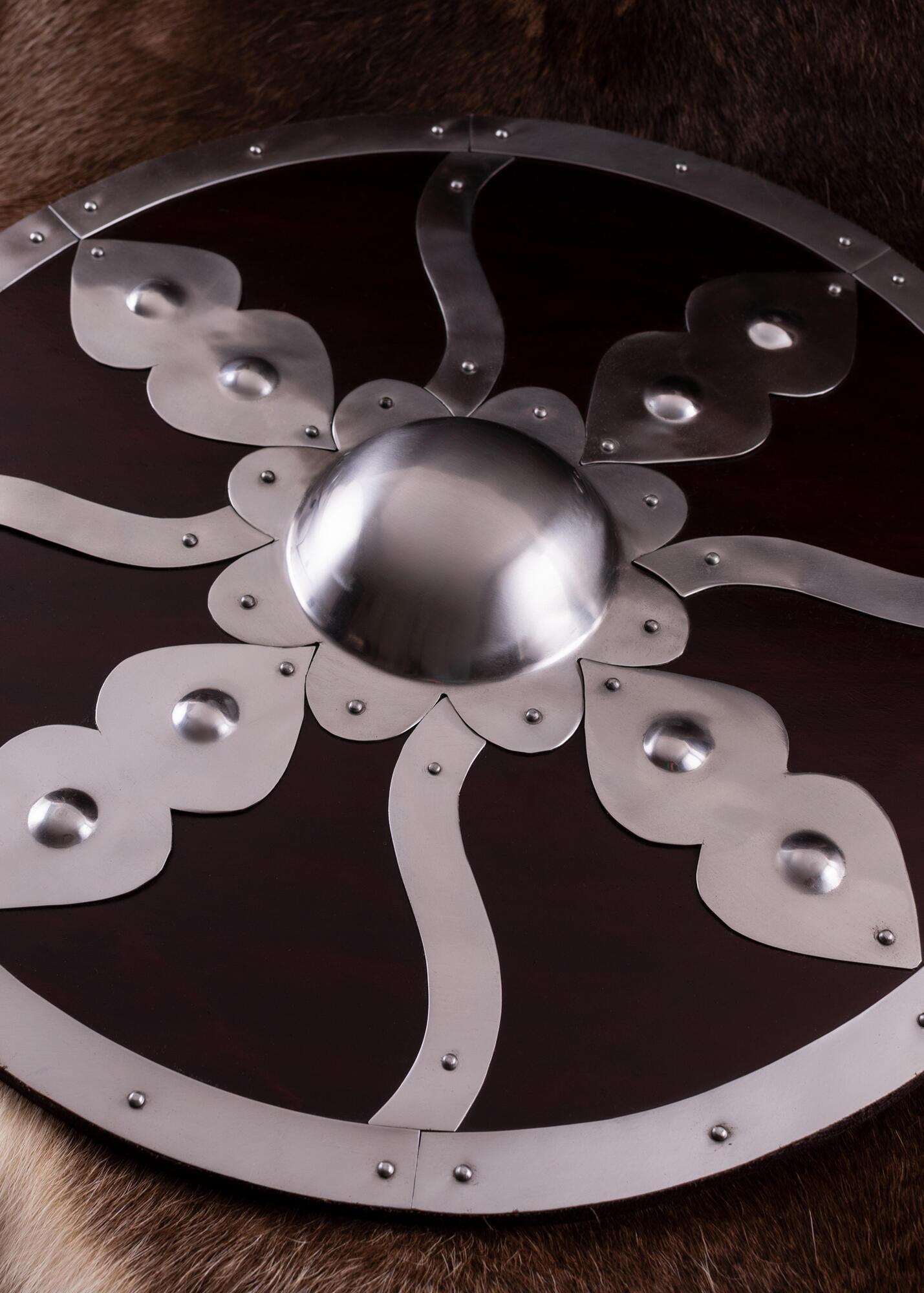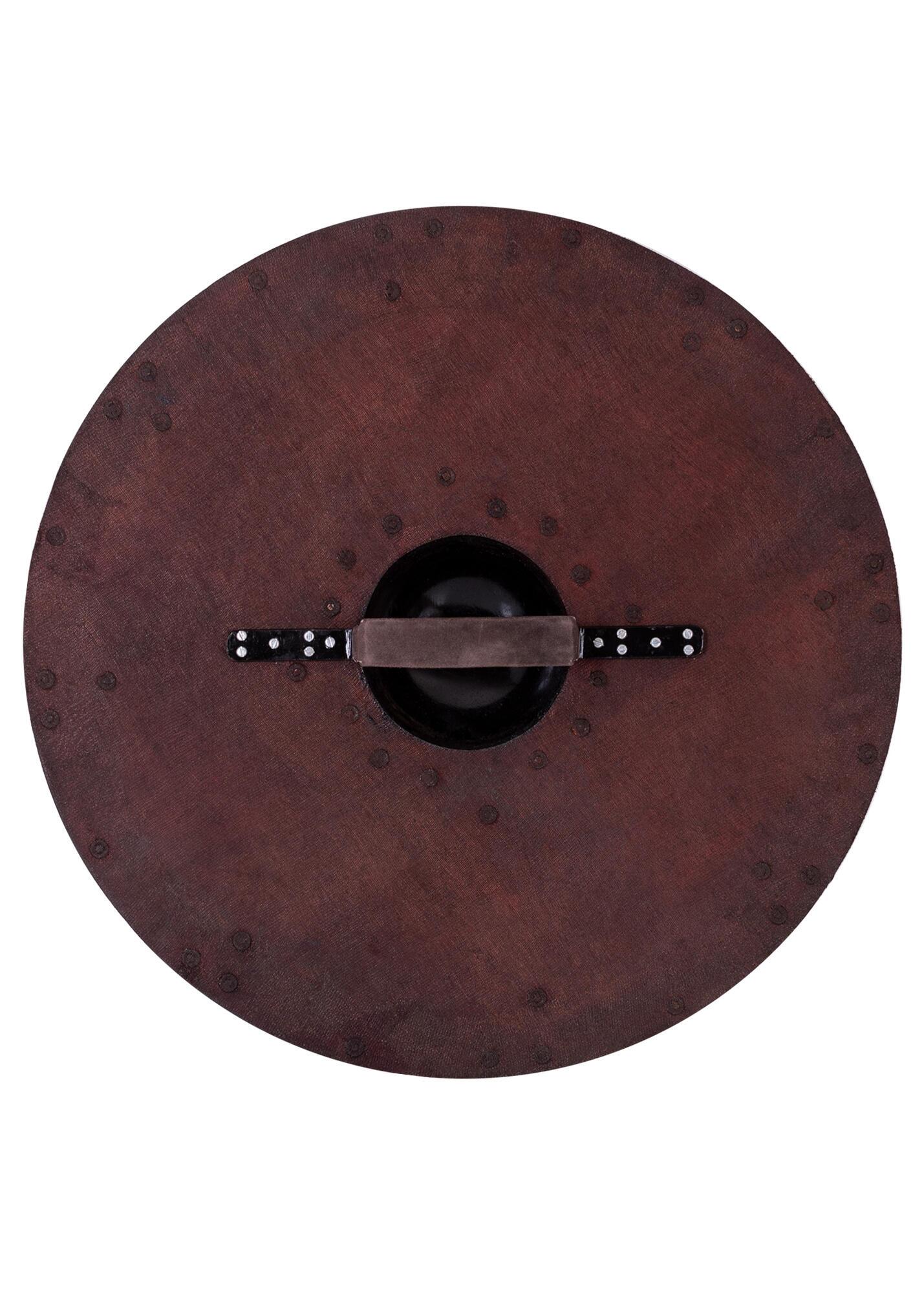 Solidt og kampklart rundskjold fremstillet i træ og udstyret med stålbule samt ca. 1,2 mm tykke stålbeslag. Konstruktionen giver både et robust udtryk og god holdbarhed ved brug.