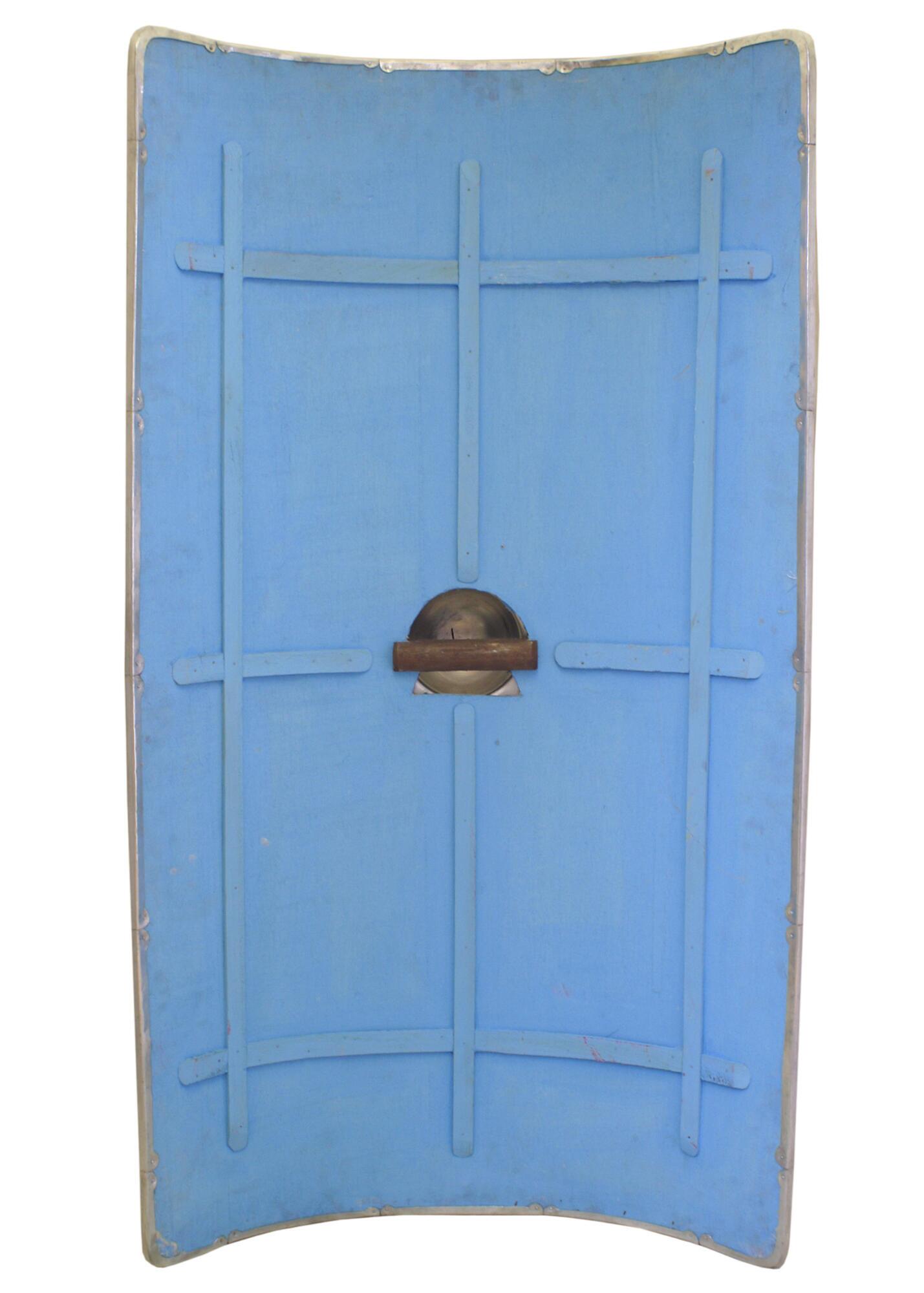 Skjoldbulen (umbo) og kanten er fremstillet af fortinnet messing, som minder meget om de originale beslag i fortinnet bronze. Af praktiske hensyn er bulen monteret med skruer og afrundede skruekapper. Bagsiden er forstærket med trælameller, hvilket giver ekstra stabilitet og holdbarhed.