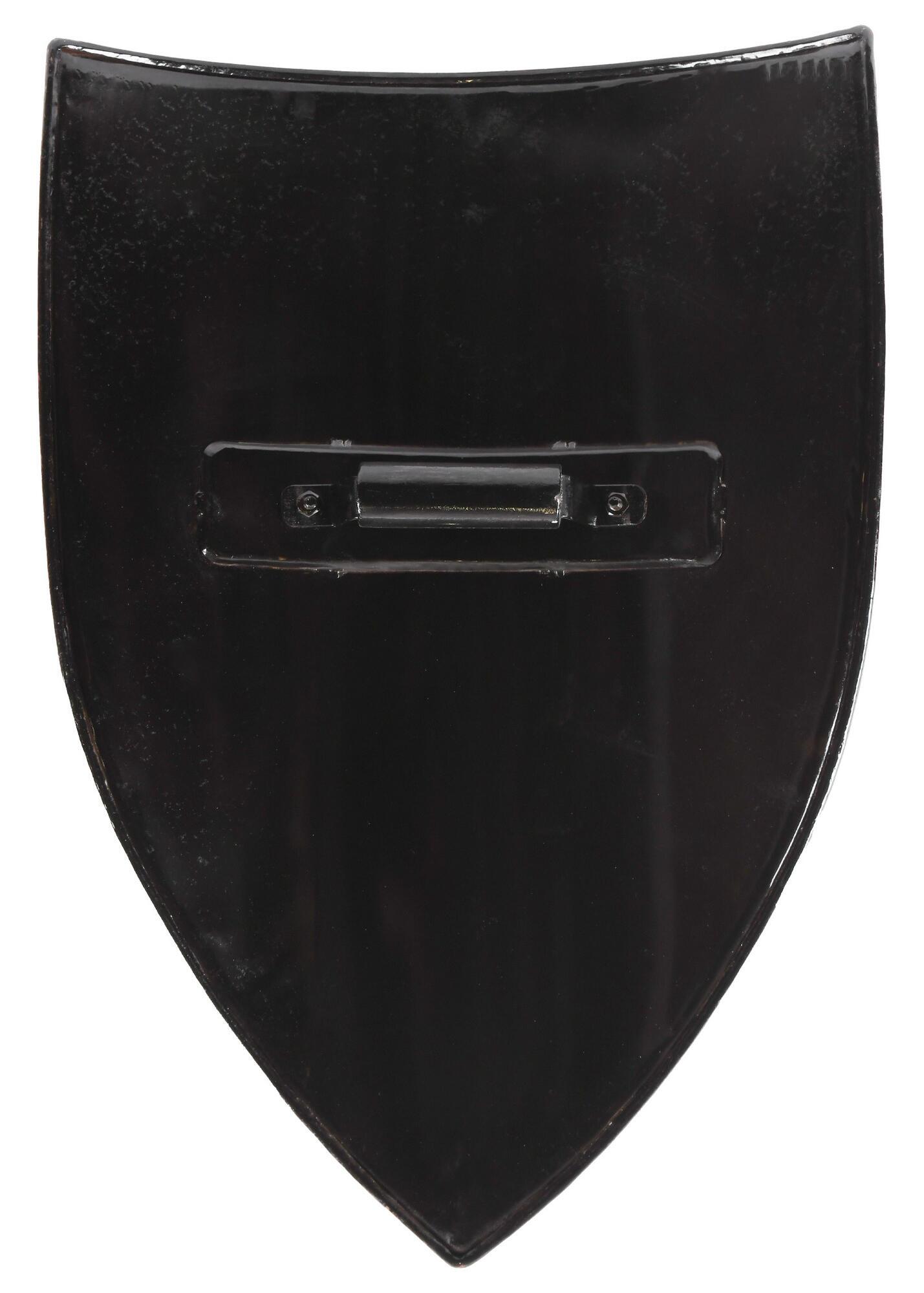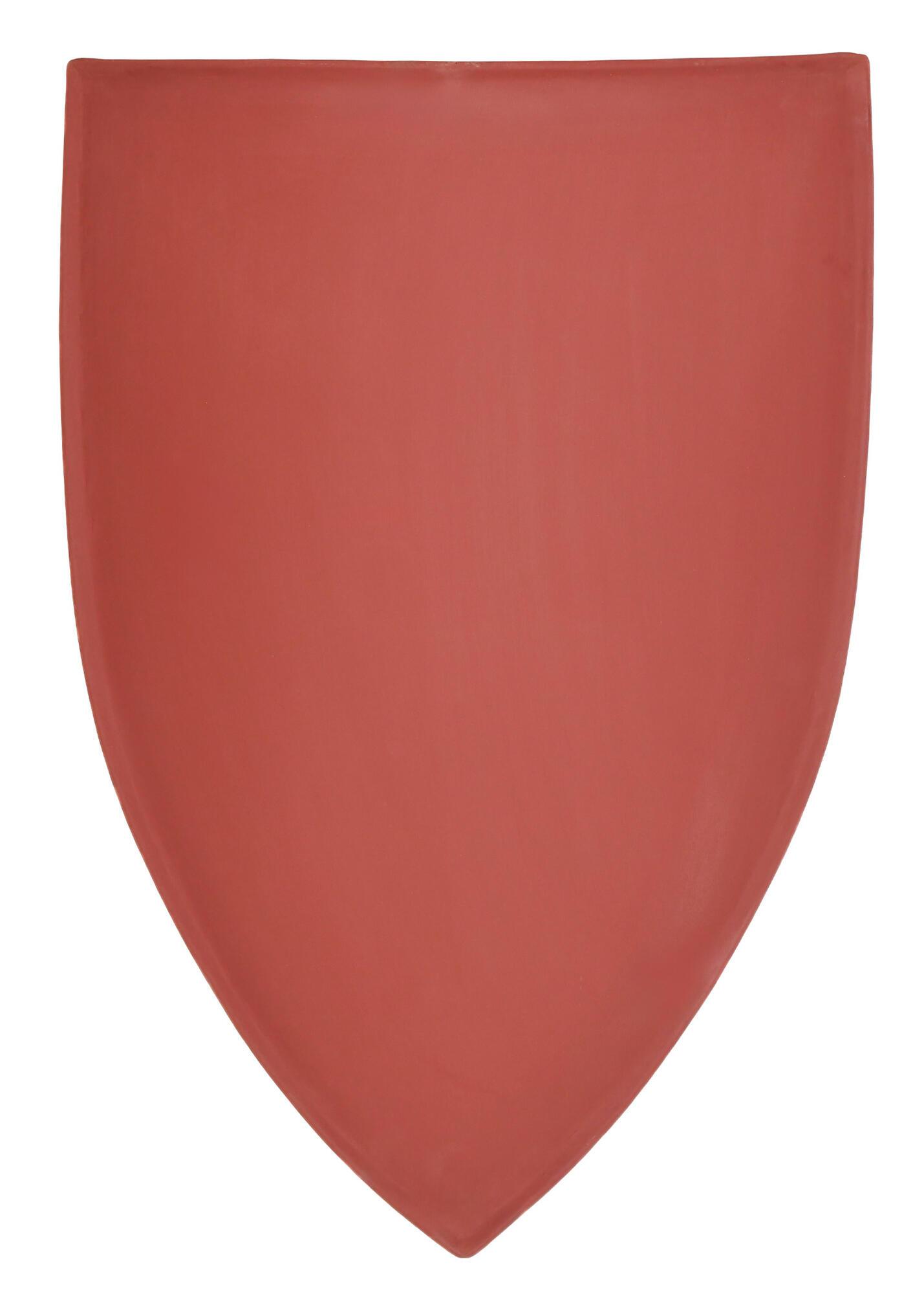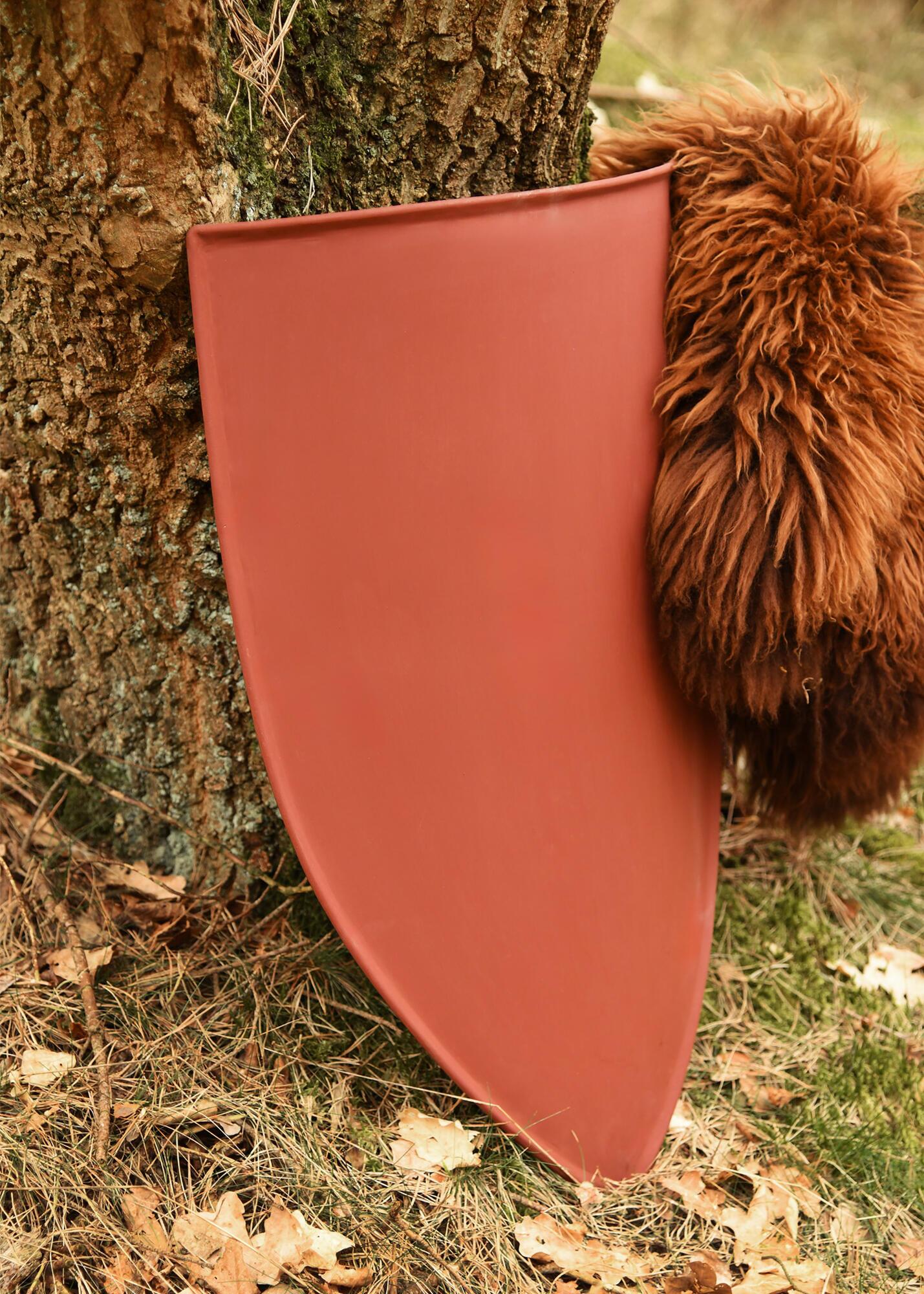 Dette solide skjold er fremstillet i stål og leveres med en rød rustbeskyttende grundmaling. Den enkle overflade gør skjoldet ideelt til dig, der selv ønsker at male det i dine egne farver eller dekorere det med våbenskjold, symboler eller mønstre.