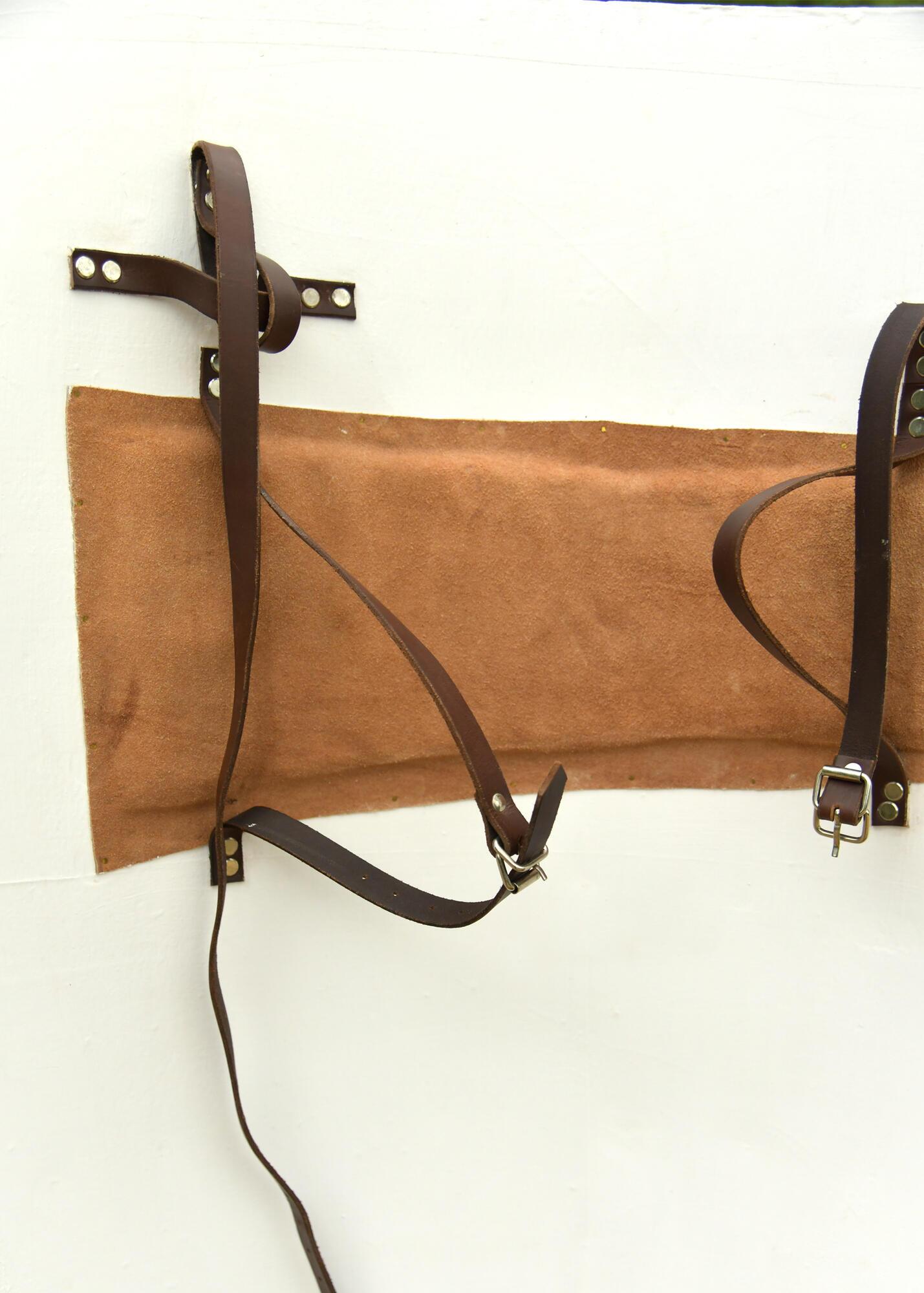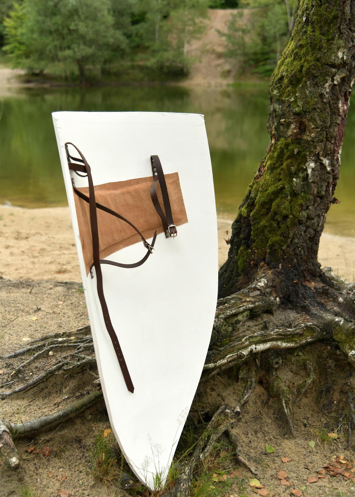 På bagsiden findes en blød armpolstring beklædt med læder, som giver bedre komfort under brug. Derudover er skjoldet udstyret med justerbare læderremme, der er solidt fastgjort til træet, så skjoldet kan bæres stabilt og sikkert.