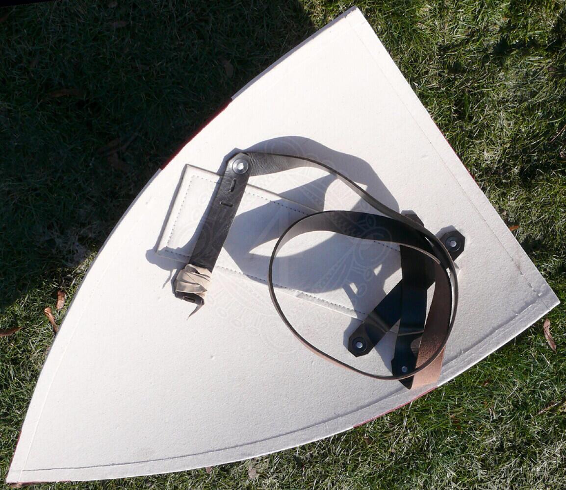 Skjoldet er fremstillet af buet træ, hvilket giver den autentiske, let hvælvede form, som historiske ridderskjolde havde. Forsiden er beklædt med hvidt lærred og prydet med et markant rødt kors, et symbol der traditionelt forbindes med tempelridderordenen og korsfarertiden.