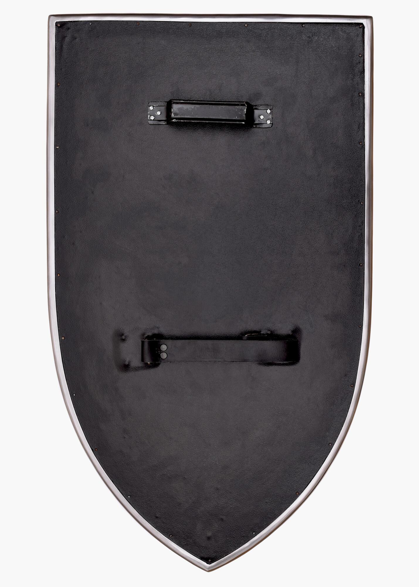 Dette klassiske heater-skjold er fremstillet i træ og forstærket med robuste stålbeslag. Skjoldets form var meget udbredt i middelalderen og giver god beskyttelse samtidig med, at det er nemt at håndtere i kamp eller under opvisning.
