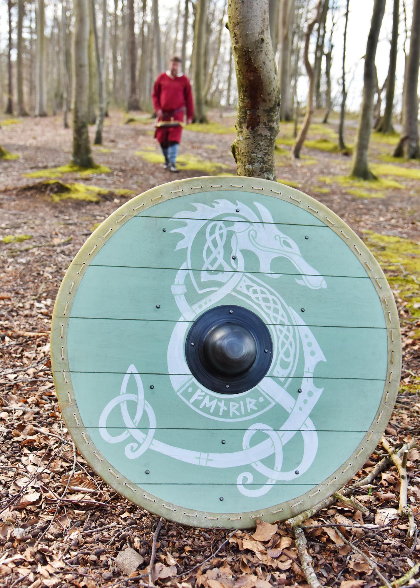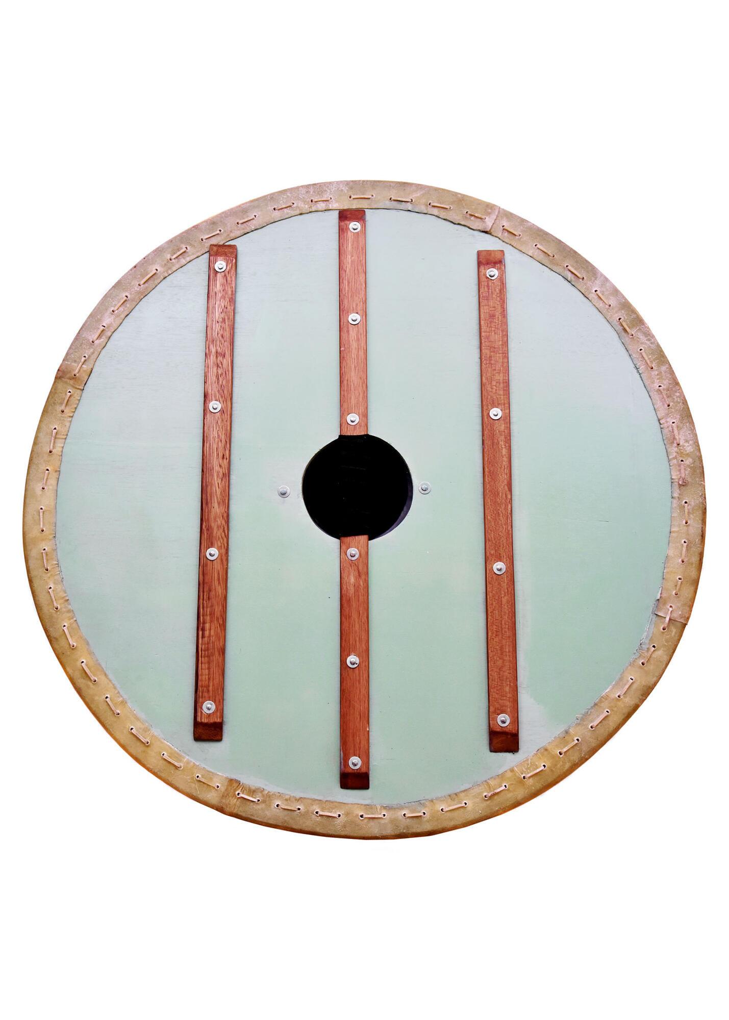 Skjoldet har en stor stålbule i midten, fastgjort med fire nitter og med god plads til hånden. Kanten er beklædt med råhud (pergament), som beskytter og forstærker skjoldet. Bagsiden er udstyret med tre fastnittede træforstærkninger, hvor den midterste fungerer som håndtag og er omviklet med læder for et komfortabelt greb.