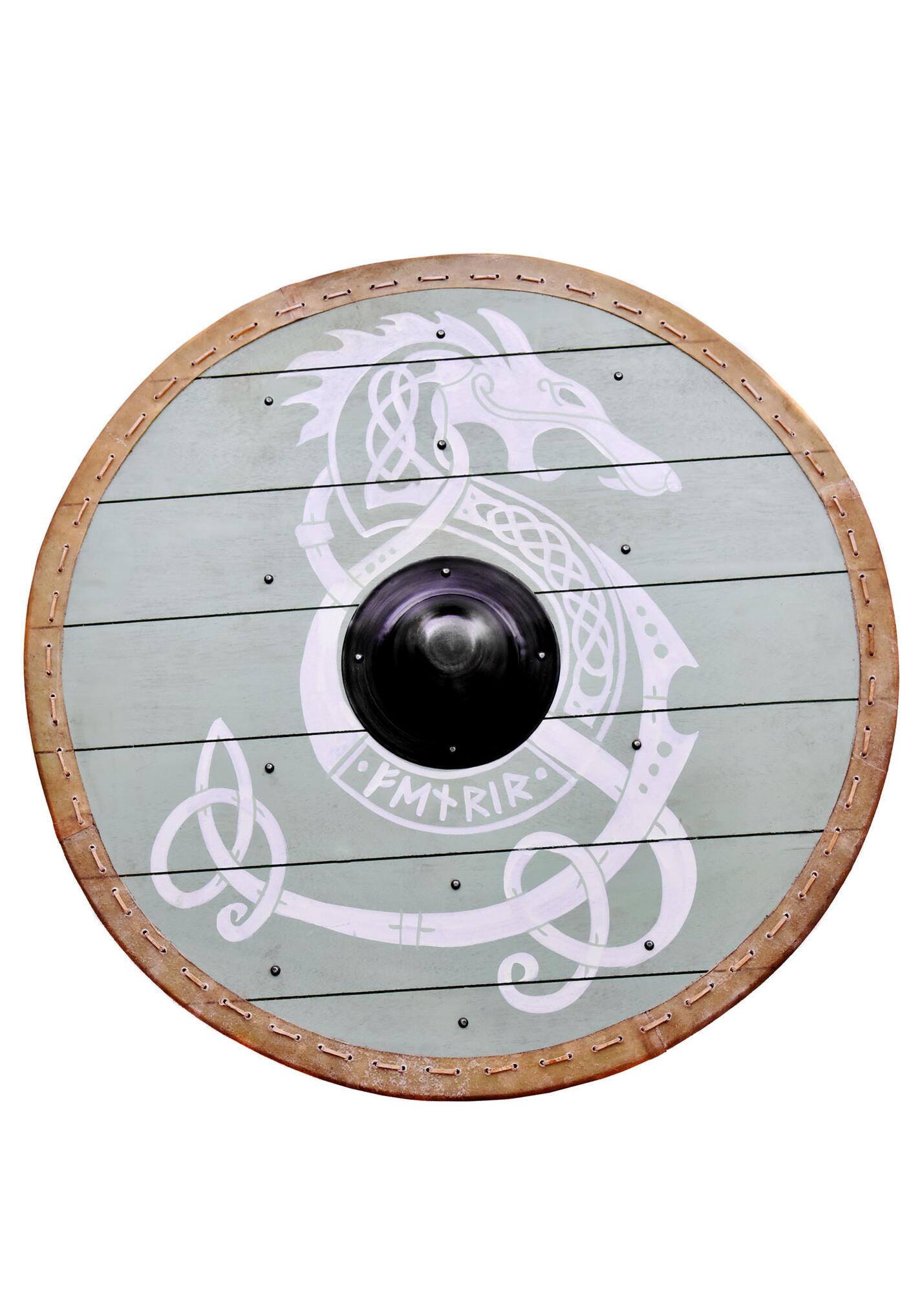 Stort og imponerende vikinge-rundskjold fremstillet af ca. 13 mm kraftig krydsfiner og dekoreret med et stiliseret motiv af ulven Fenrir (også kendt som Fenris eller Fenrisúlfr). Rundt om motivet ses en runerække fra den ældre Futhark, som staver hans navn.