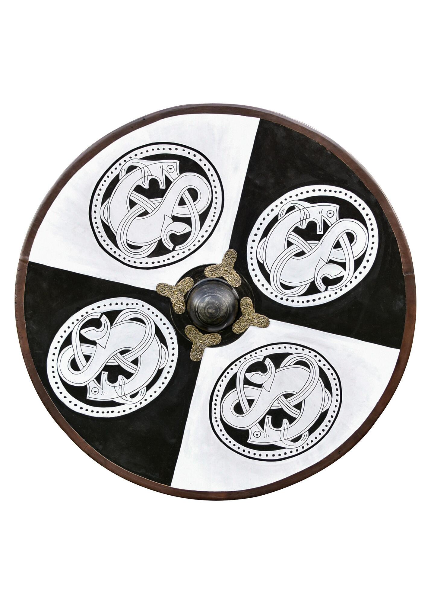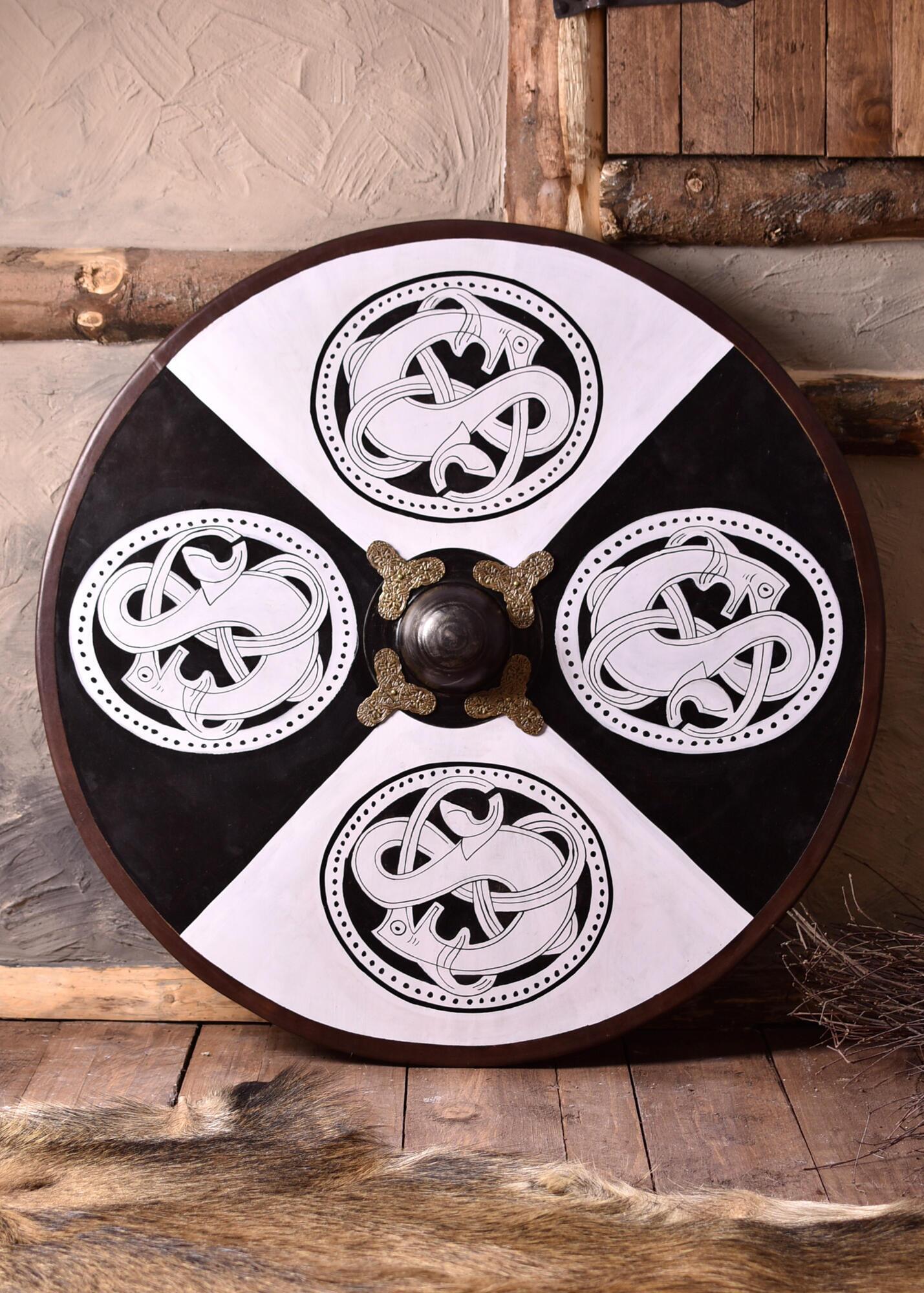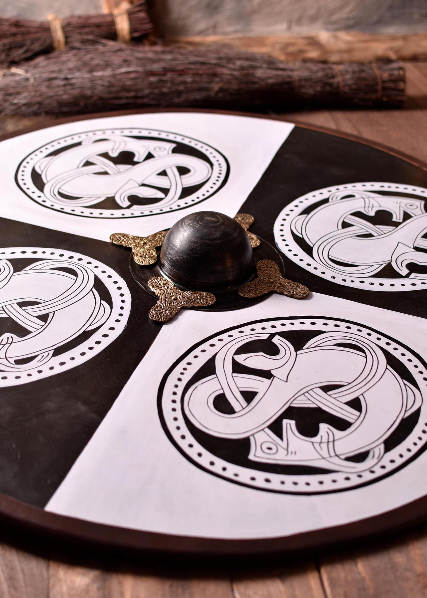 Flot rundt vikingskjold fremstillet af ca. 13 mm kraftig krydsfiner og dekoreret med fire nordiske Gripping Beast-motiver – stiliserede dyr eller drager kendt fra vikingetidens kunst. Motivet kan også tolkes som en fremstilling af Midgårdsormen fra nordisk mytologi.