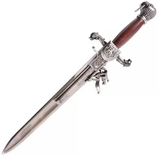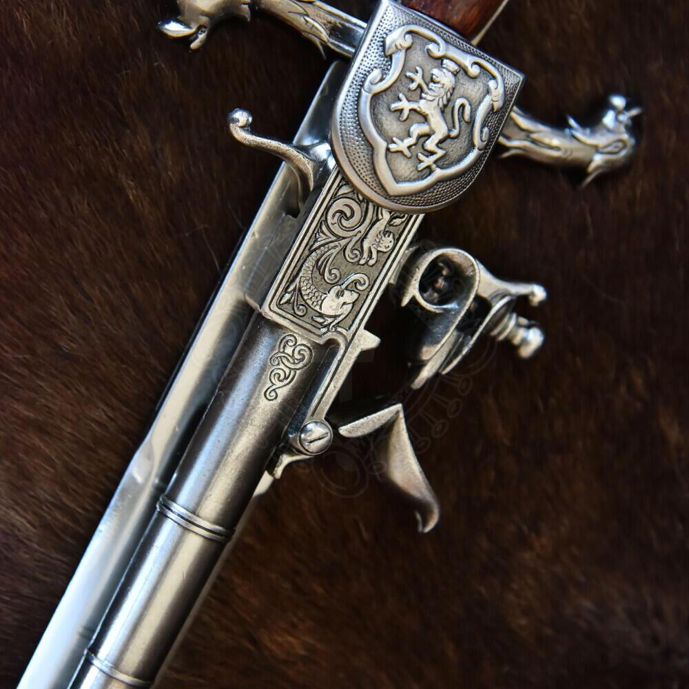 Denne German Dagger Pistol Replica er en detaljeret gengivelse af en usædvanlig våbentype fra 1700-tallet – en kombination af daggert og flintelåspistol samlet i ét stykke. Oprindeligt var denne type våben specialfremstillet og relativt sjælden, men blev især forbundet med søfartens tidsalder, hvor både flådestyrker og pirater anvendte lignende kombinationsvåben til nærkamp i trange omgivelser.