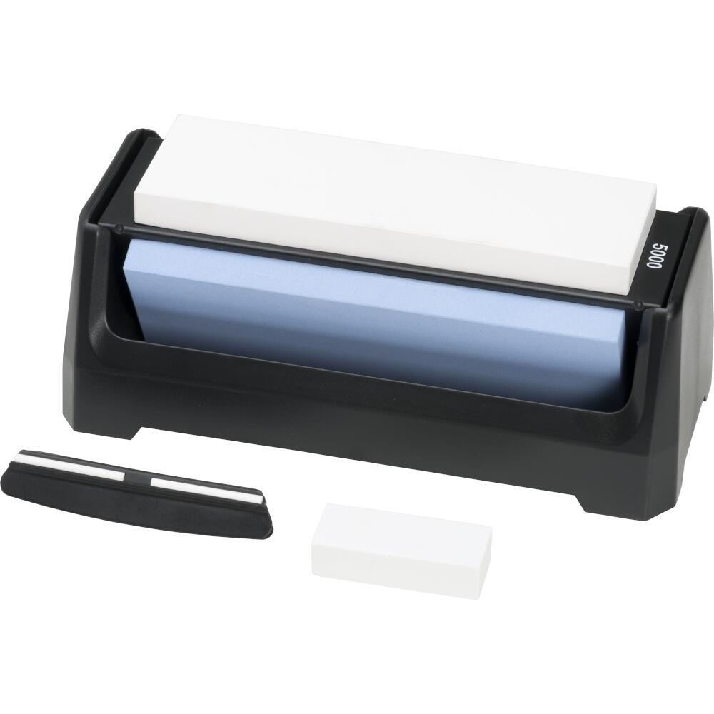 Den medfølgende skridsikre base har en integreret opsamlingsbeholder til slibevand, som holder arbejdsområdet mere rent og stabilt under brug. Sættet indeholder desuden en opruningssten (flattening stone) til vedligeholdelse af slibefladen samt en slibeguide, der hjælper med at holde korrekt vinkel under slibningen.