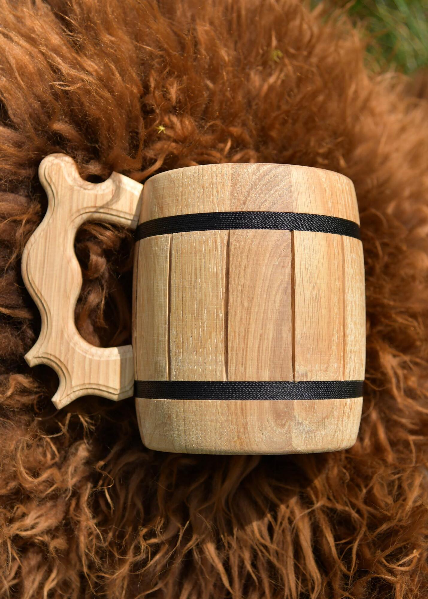 Dette rustikke ølkrus er fremstillet i egetræ og udformet i et klassisk tøndelook, som giver kruset et autentisk og historisk inspireret udtryk. De dekorative “tøndebånd” er udført som en snoning af snor, hvilket understreger det traditionelle håndværkspræg.