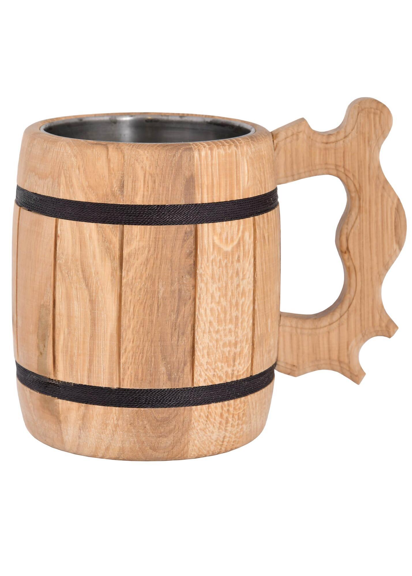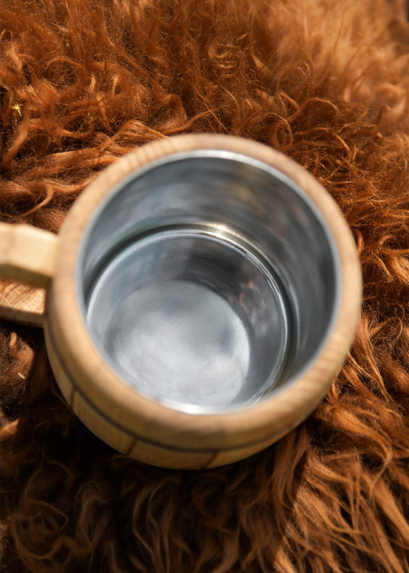 Kruset er udstyret med en indvendig indsats i rustfrit stål. Denne stålindsats gør kruset mere hygiejnisk i brug og sikrer, at du kan nyde øl, mjød eller andre drikke uden at væsken kommer i direkte kontakt med træet.