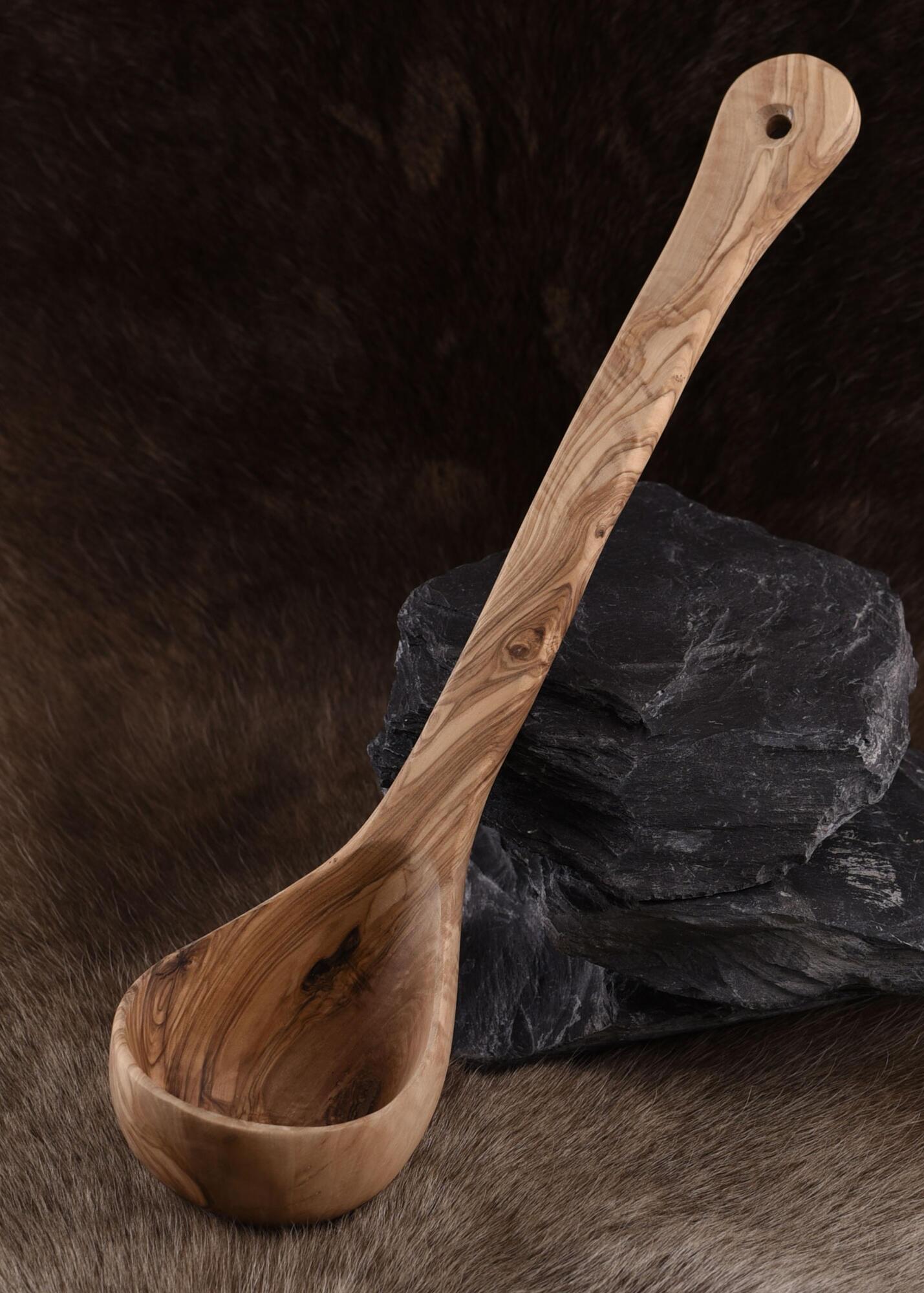 Denne flotte øseske er håndlavet af oliventræ og har en praktisk læderstrop, så den nemt kan hænges op i køkkenet eller ved arbejdsområdet. Oliventræ er et særligt hårdt træ, som gør redskabet modstandsdygtigt over for slid og samtidig mindre modtageligt for lugt.