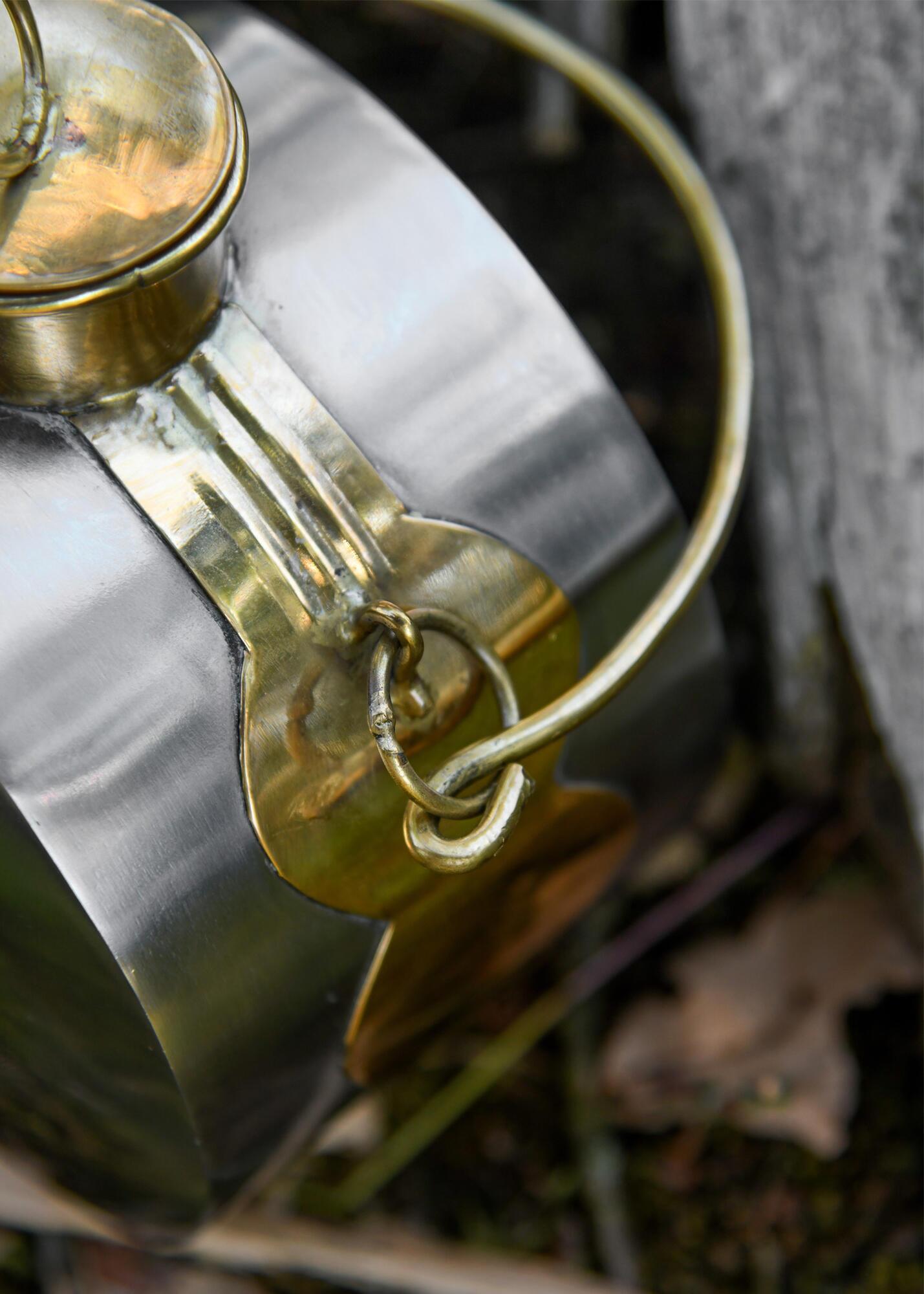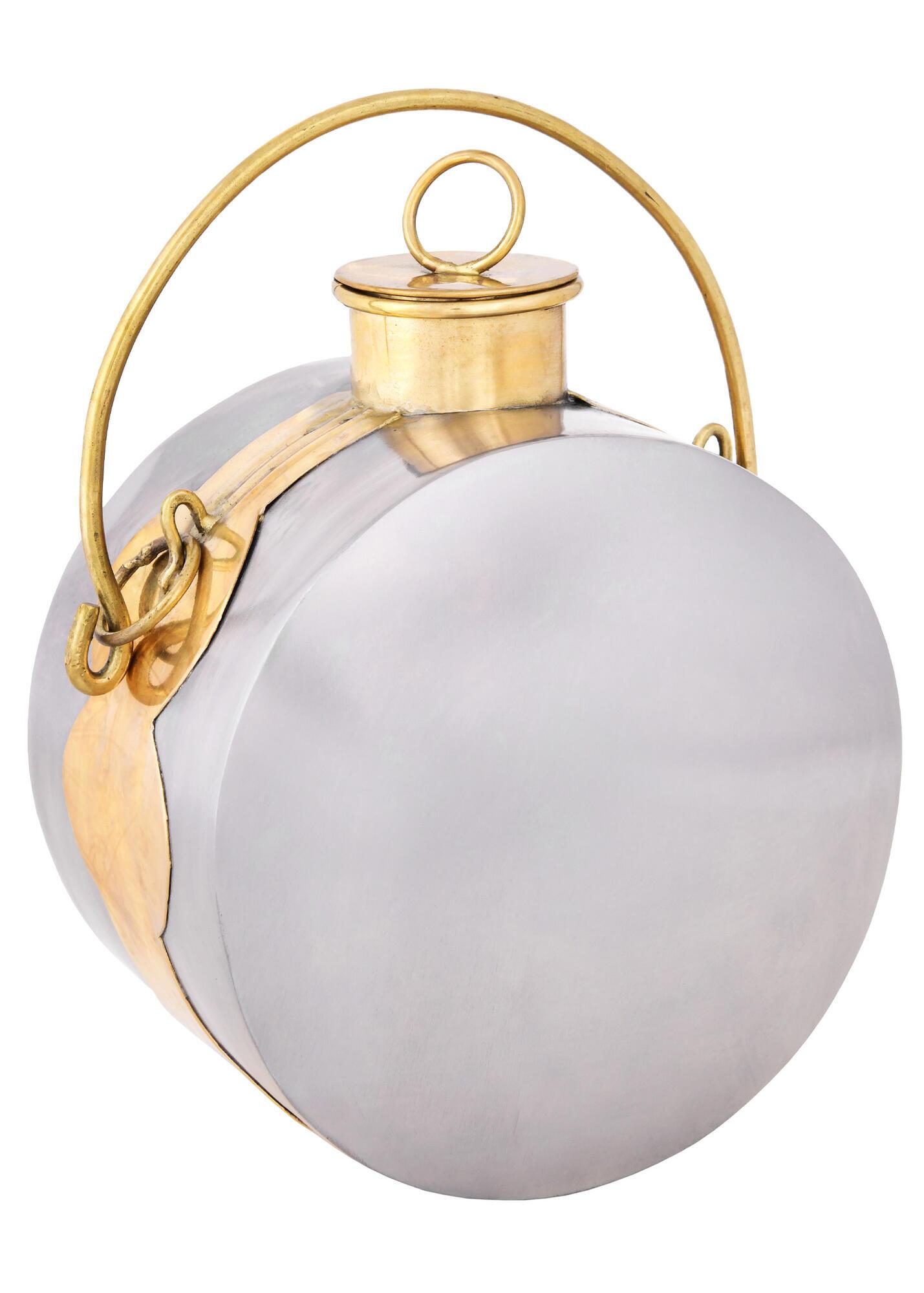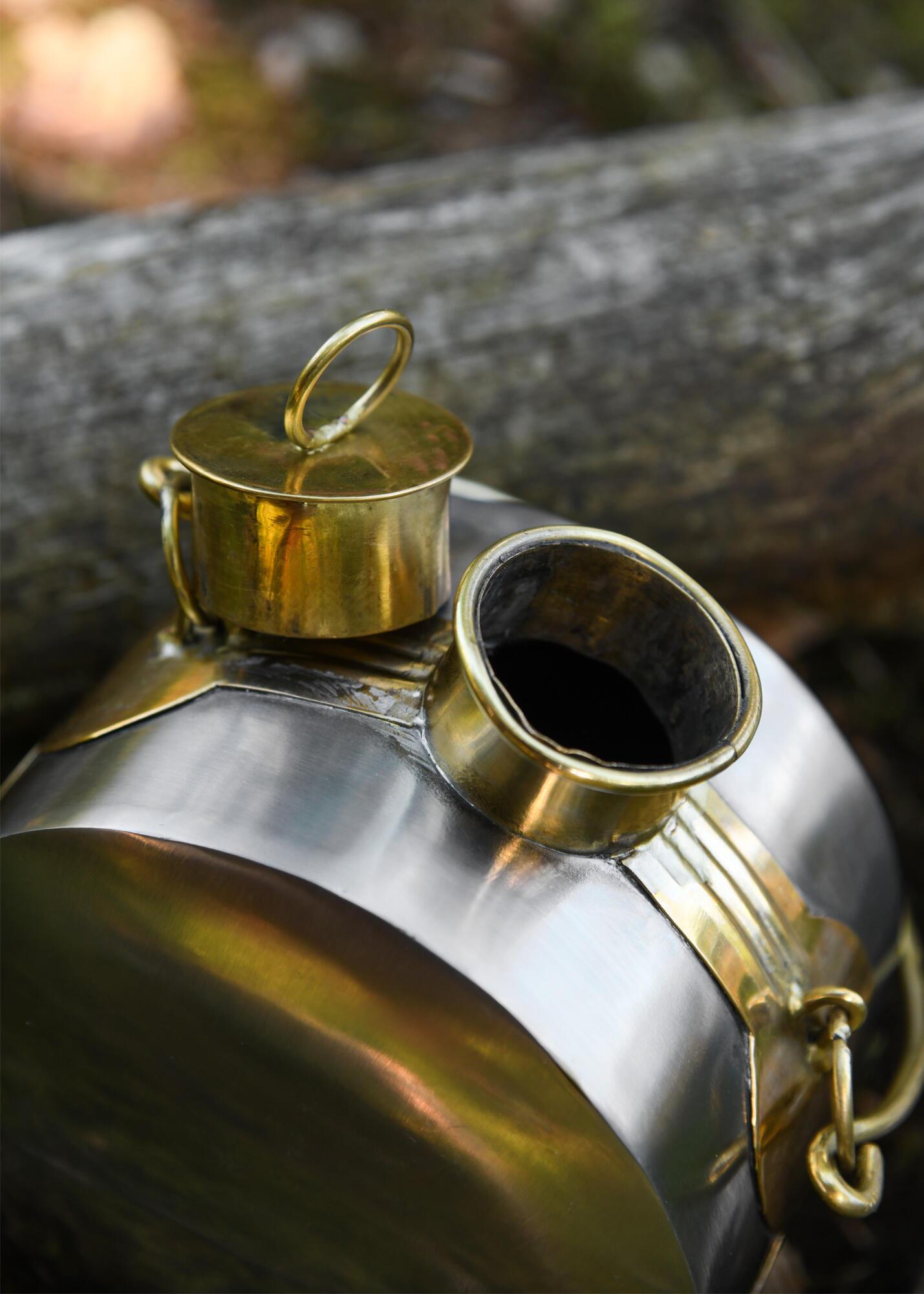 Feltflasken er fremstillet af jern og messing, ligesom de historiske originaler. Indvendigt er den belagt med bivoks, men da materialerne kan danne rust, egner flasken sig primært som historisk rekvisit eller dekorationsgenstand.
