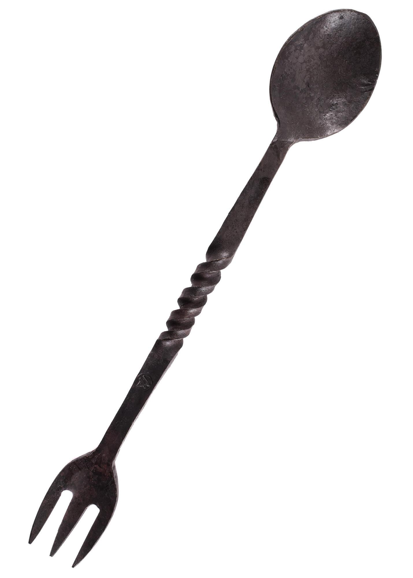 Denne praktiske spisegenstand kombinerer ske og gaffel i ét redskab. Den enkle og robuste udformning gør den velegnet til historiske lejre, reenactment, LARP og friluftsliv, hvor et kompakt og funktionelt bestik er en fordel.