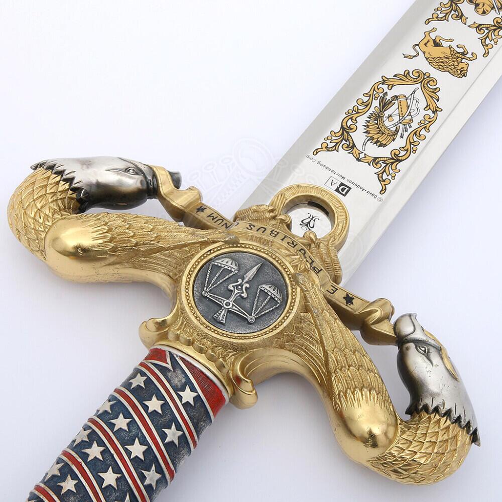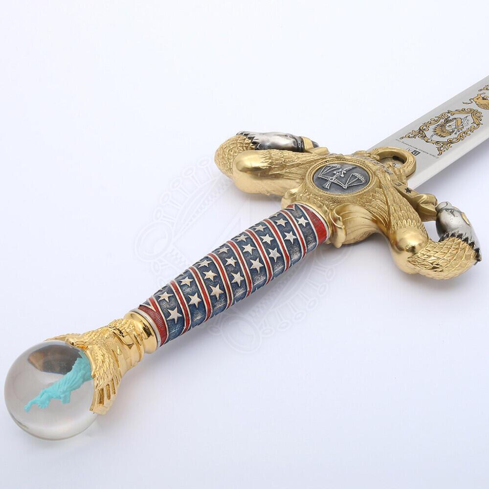Den massive parérstang formes af to ørnehoveder, som holder en medaljon med retfærdighedens vægt og inskriptionen “E Pluribus Unum”. Grebet bærer farver inspireret af det amerikanske flag og er dekoreret med femtakkede stjerner. Pomlen rummer en unik glaskugle med Frihedsgudinden indeni, hvilket gør sværdet til et sandt udstillingsstykke.