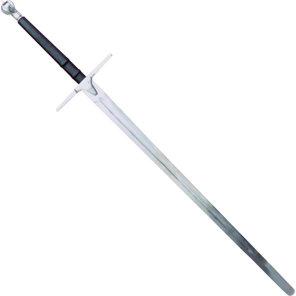 Parérstang og pommel er fremstillet i stål og bidrager til sværdets solide og autentiske udtryk. Grebet er beklædt med læder, hvilket giver et sikkert og komfortabelt greb – særligt vigtigt ved tohåndsbrug.