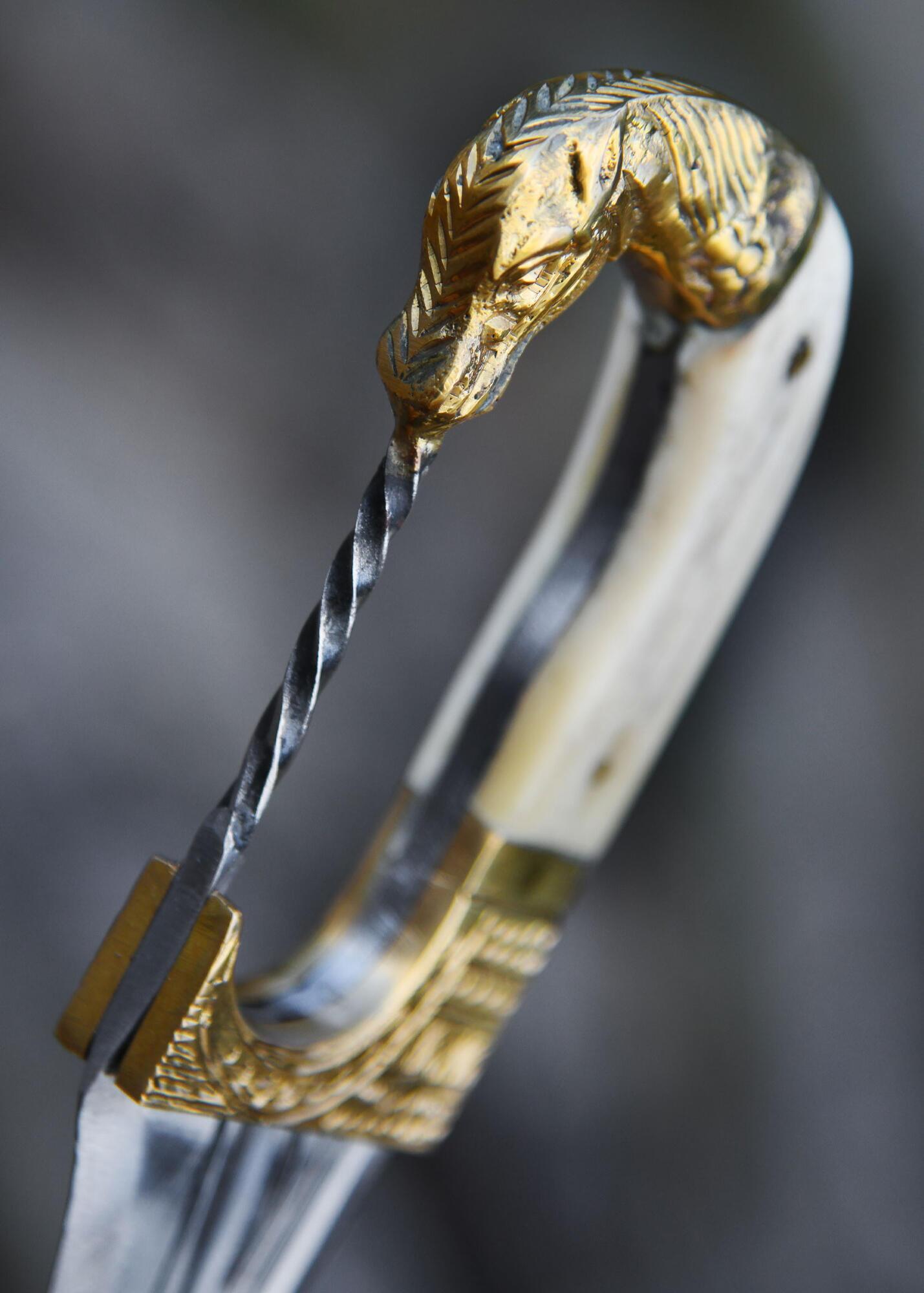 Det første, der fanger øjet, er det rigt dekorerede greb i massiv messing, formet som et elegant hestehoved – et symbol på styrke og status. Grebsskallerne er fremstillet af ægte ben og fastgjort med messingsøm, hvilket giver hver enkelt falcata sit helt eget unikke udtryk.