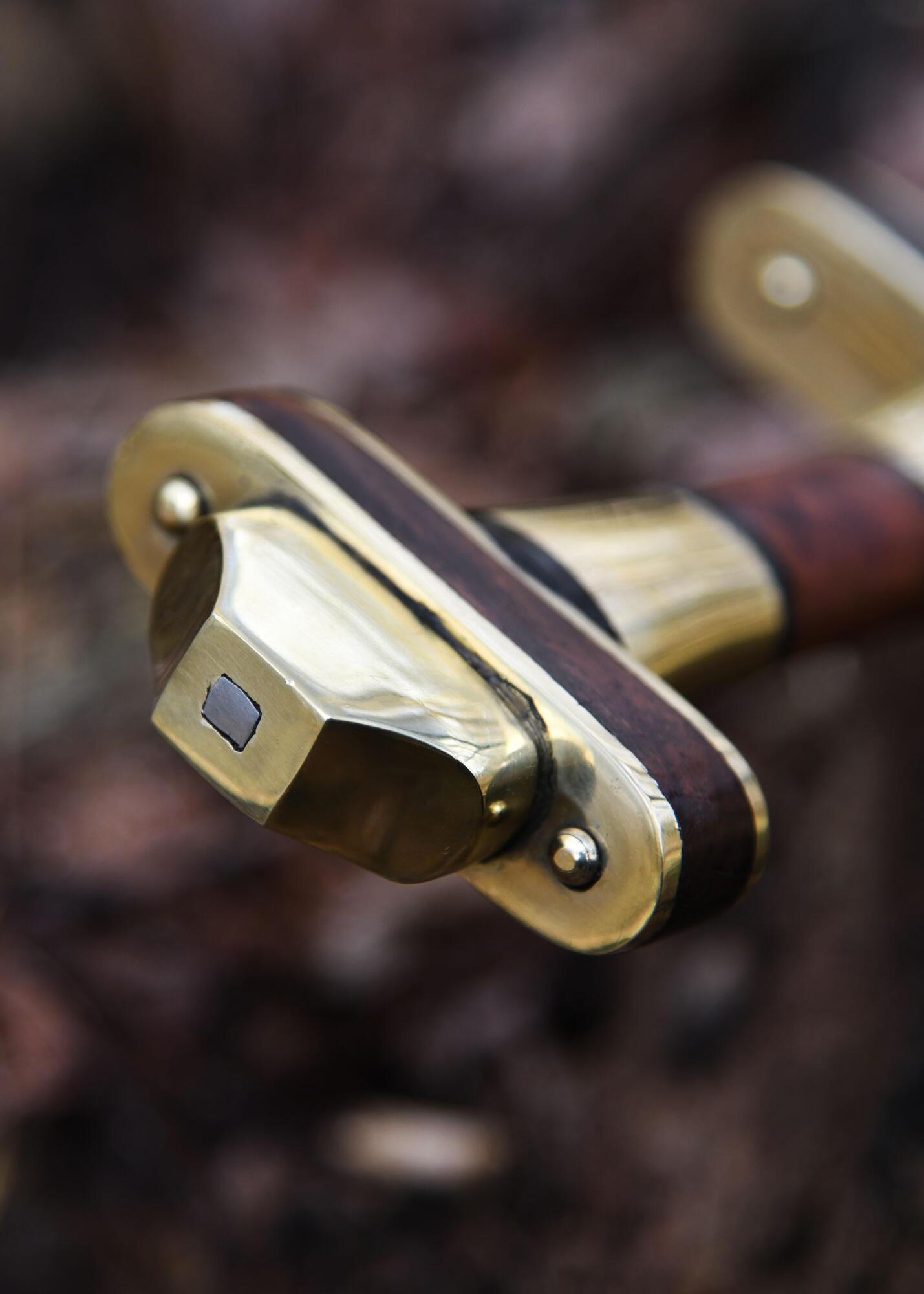 Parérstang og pommel er opbygget af nittede messingplader omkring en kerne af kohorn – en detalje, der giver et autentisk og eksklusivt udtryk. Grebet kombinerer træ, messing og horn i klassisk folkevandringstidsstil.