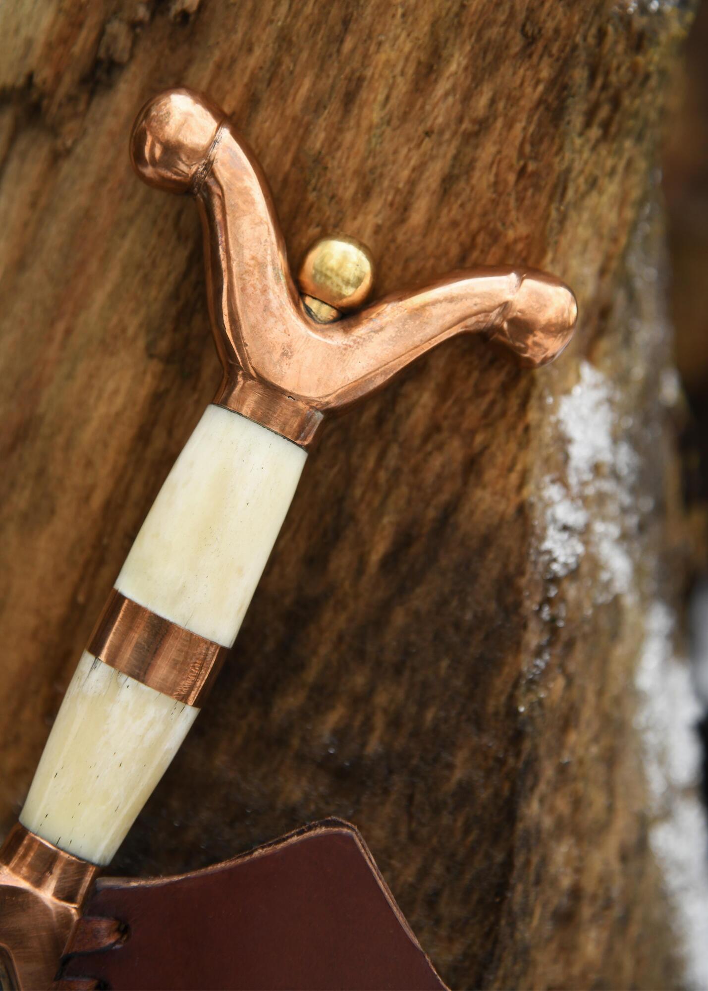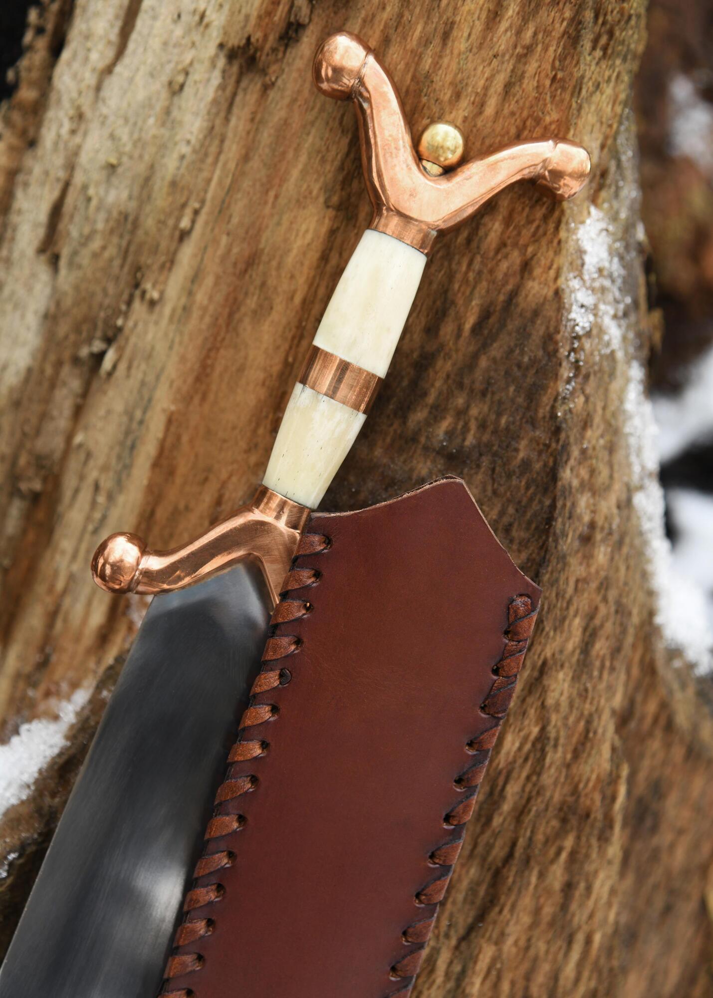 Klingen er fremstillet i kulstofstål og giver et autentisk historisk udtryk. Kombinationen af kobber, messing og ben i grebet skaber en smuk kontrast og understreger sværdets ceremonielle karakter.