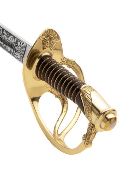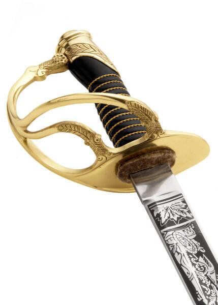 Klingen er smukt ætset med “U.S.” og “E Pluribus Unum” samt bladværk og militære trofæer.