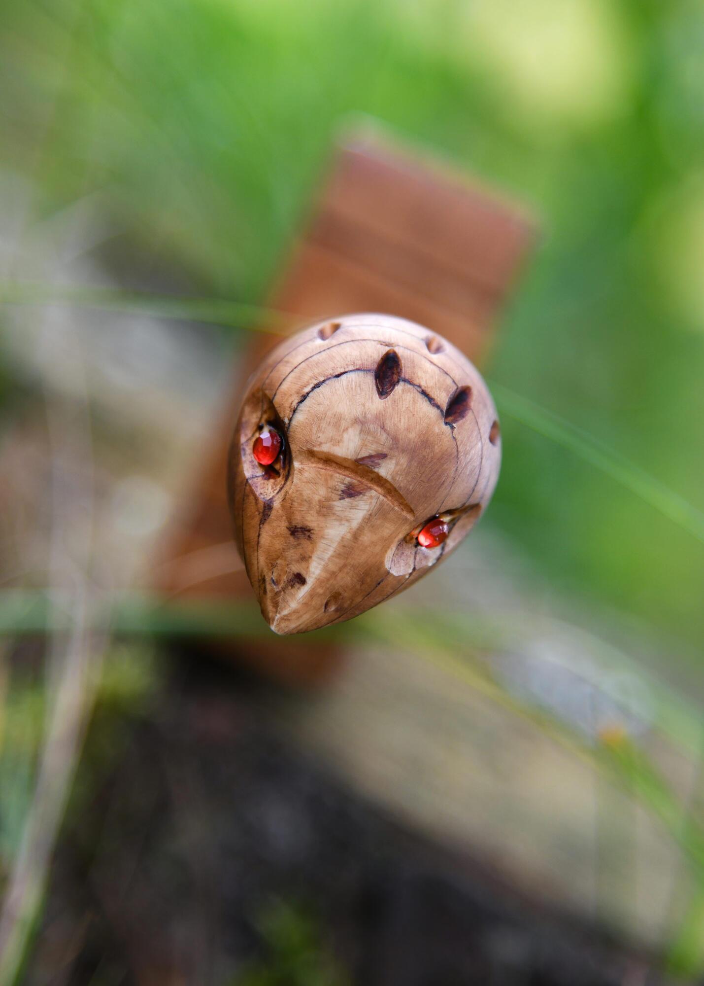 Grebets mest markante detalje er pommelen udformet som et ørnehoved – et stærkt romersk symbol på magt og imperium. Grebet er udskåret i ægte ben, hvilket giver hver enkelt model sit eget naturlige og unikke udtryk.