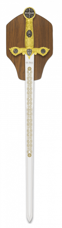 Dette Tempelridder sværd “Alba Gold” kombinerer klassisk middelalderinspiration med et mere elegant og dekorativt udtryk. De gyldne detaljer giver sværdet et eksklusivt præg, der gør det velegnet til udstilling.