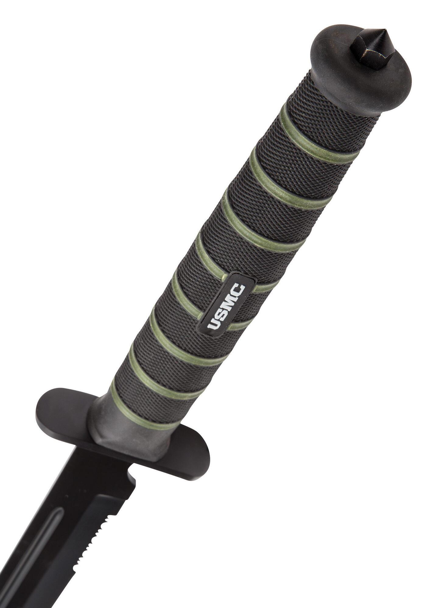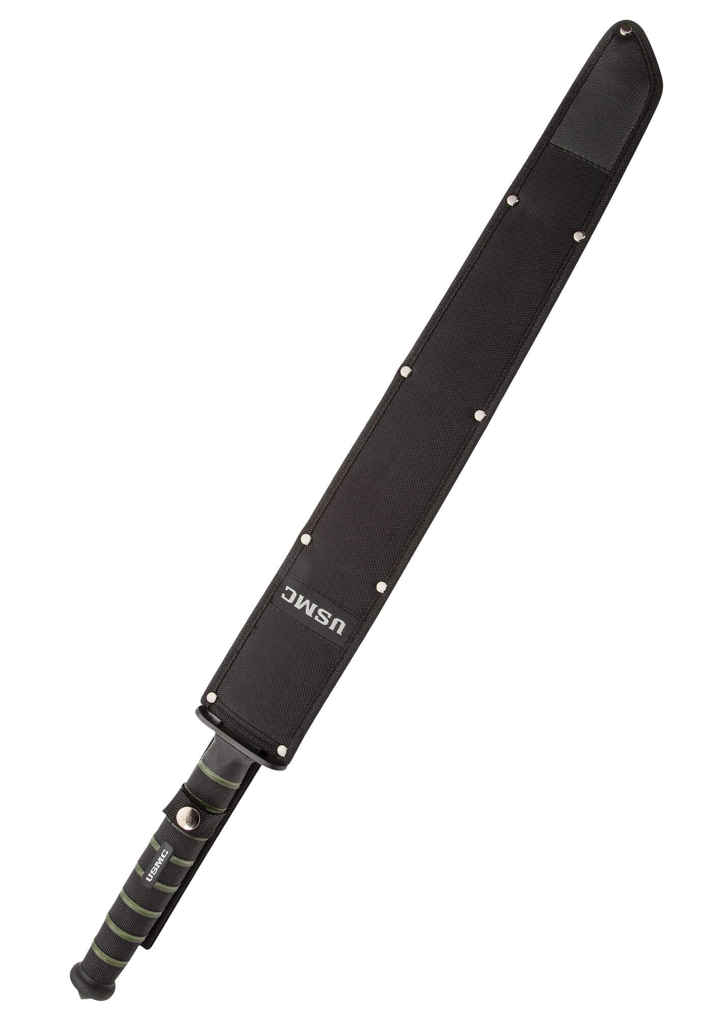 Der medfølger en sort heavy-duty nylonskede med bæltestrop og broderet USMC-logo, så sværdet kan transporteres og opbevares sikkert.