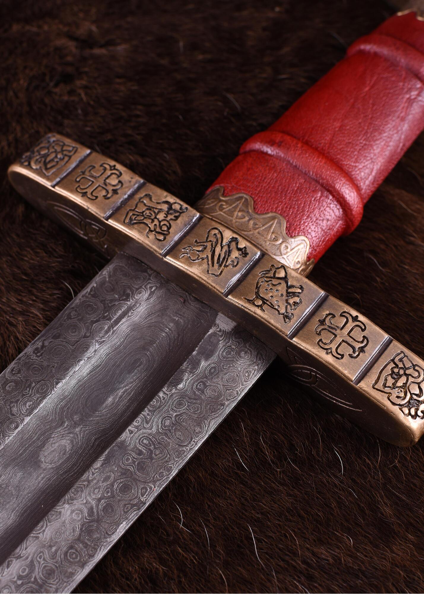 Parerstangen og den markante femlappede knop er støbt i messing og gengiver de fine indgraveringer og mønstre fra det arkæologiske originalfund.