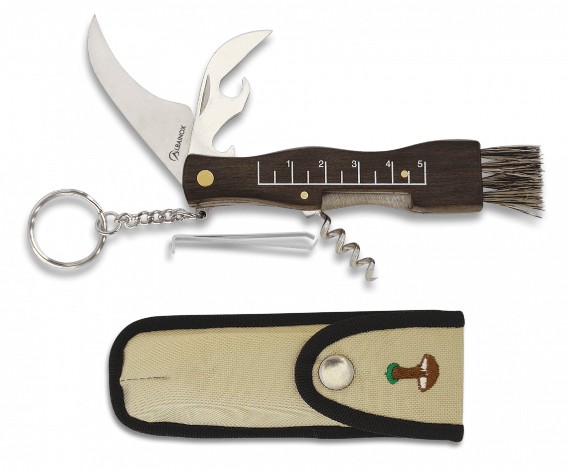 Kniven er udstyret med både børste og pincet, så du nemt kan rense og klargøre svampene direkte i skoven – en praktisk detalje, der gør en stor forskel på turen.