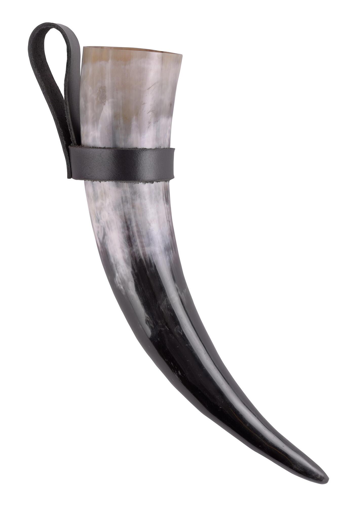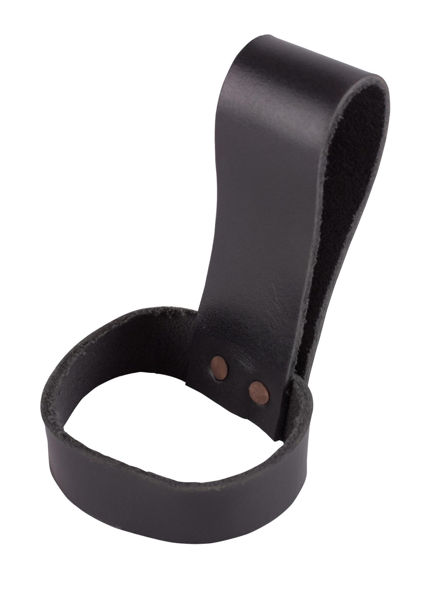 Denne enkle og prisvenlige bælteholder til drikkehorn er fremstillet af to nittede læderremme i kraftigt okselæder. Holderen gør det nemt at have sit drikkehorn med ved bæltet og er et praktisk tilbehør til vikingemarkeder, middelalderarrangementer, rollespil og reenactment.