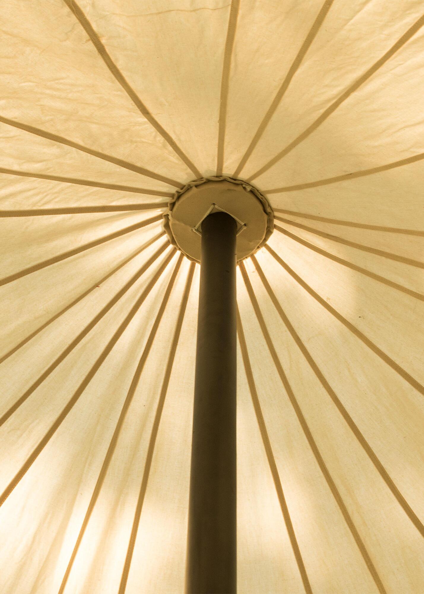 Sidevæggen monteres nemt på taget ved hjælp af små kroge. Hvis sidevæggen udelades, kan teltet også anvendes som åben pavillon eller baldakin. Designet er bevidst holdt kompakt uden indgangsbaldakin.