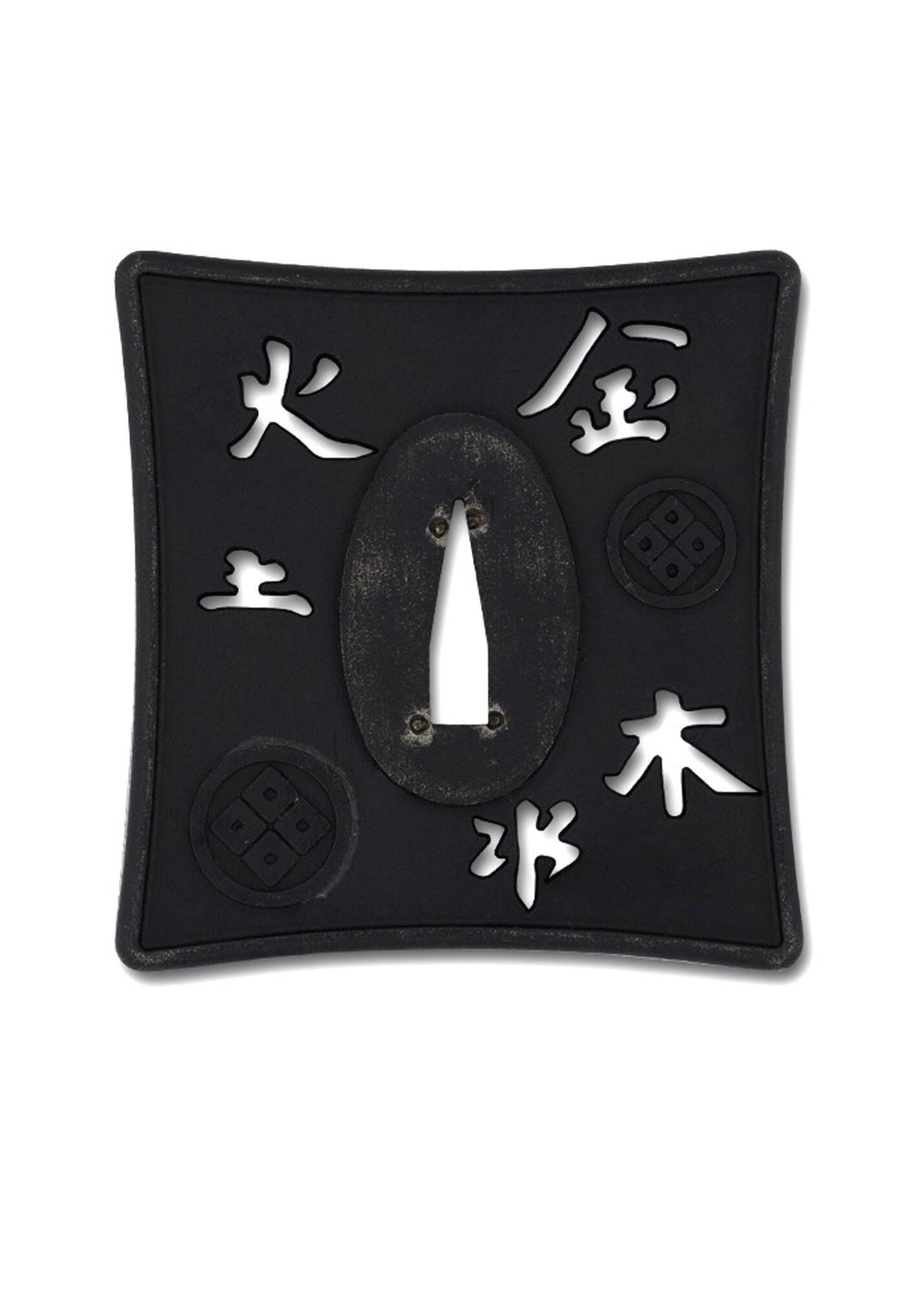 Den sortpatinerede jern-tsuba bærer Kouga-klanens mon og gennembrudte kanji-tegn, som gentages på fuchi og kashira. De sorte beslag på sayaen viderefører temaet og skaber et gennemført og autentisk udtryk.