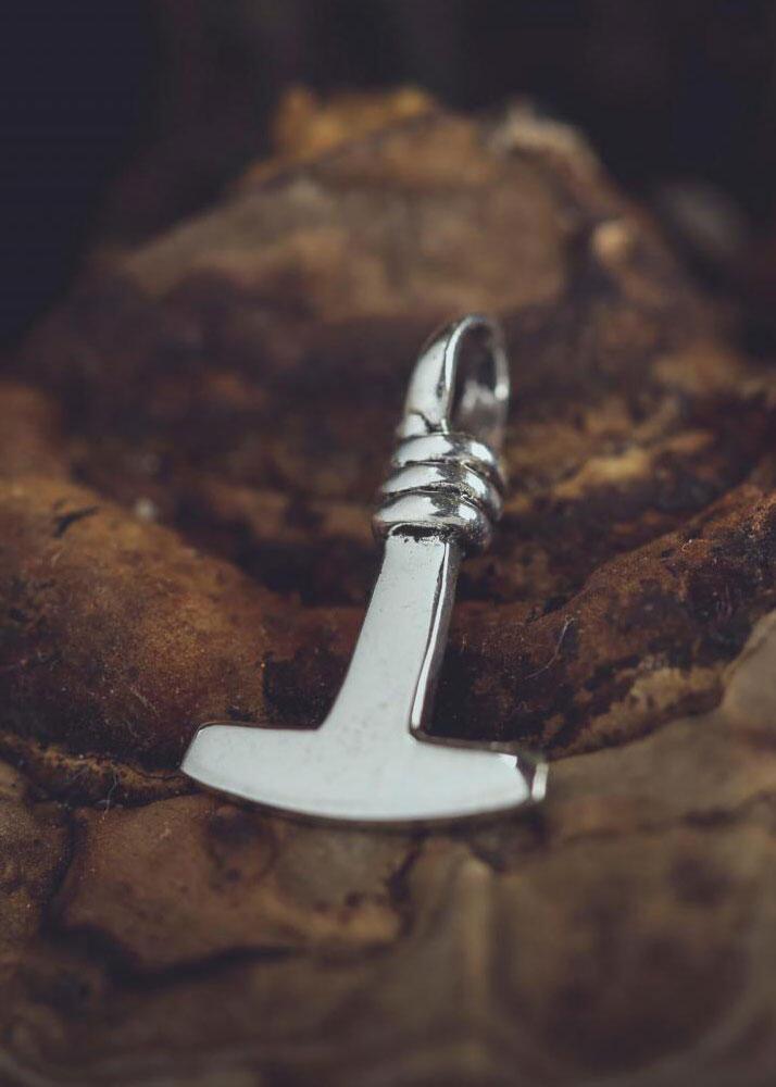 Et enkelt og stilrent vedhæng formet som den klassiske Mjölnir, Thors legendariske hammer fra den nordiske mytologi. Hammeren er et velkendt symbol på styrke, beskyttelse og forbindelsen til de gamle nordiske traditioner.