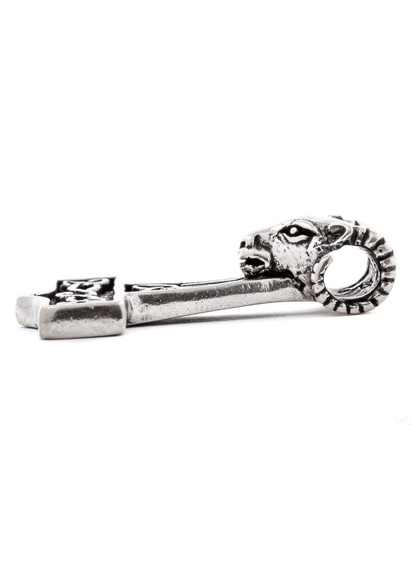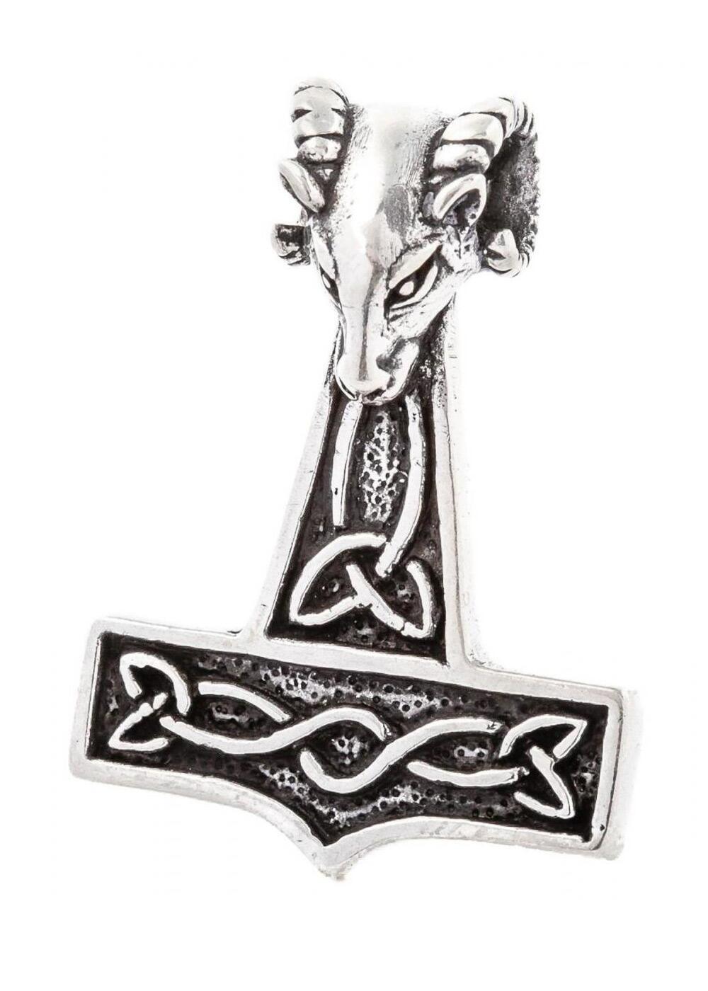 Dette markante vedhæng forestiller Mjölnir, Thors legendariske hammer fra den nordiske mytologi. Designet er udsmykket med et detaljeret vædderhoved, som giver smykket et kraftfuldt og karakteristisk udtryk inspireret af vikingetidens symbolik.